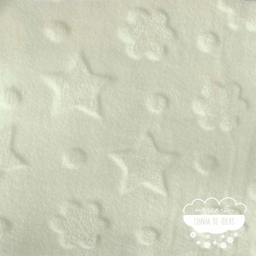 Coralina Jacquard con relieve de estrellas, lunares y flores sobre fondo crudo, también conocida como tejido coral o coral fleece. Se trata de un tejido con un pelo muy cortito, con gran capacidad térmica. Su tacto es extremadamente suave, aterciopelado, muy amoroso. Es una tela ligera y cálida que resulta ideal para la confección de mantas o plaids, batas, arrullos o mantitas de bebé, colchonetas o mantas para animales o incluso, también se podrían confeccionar prendas de abrigo como sudaderas o pijamas para los más frioleros.