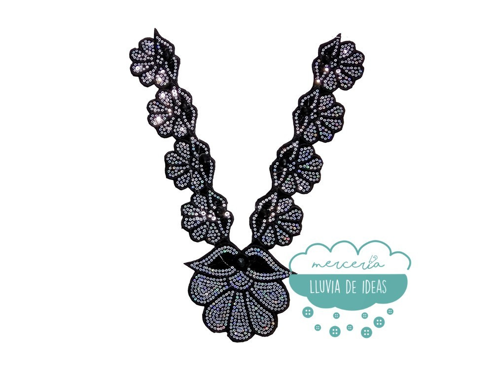 Aplicación termoadhesiva bordada con hilo de lúrex que le aporta un toque metalizado, con lentejuelas y piedras plásticas. Se puede emplear no solo como cuello sino como aplicación para customizar otras zonas como por ejemplo la espalda, aportando gran vistosidad. Referencia: X75. La base de la aplicación es antelina de color negro. Medida: ancho 29 cm. x alto 39 cm. aprox. El precio se refiere a la unidad.