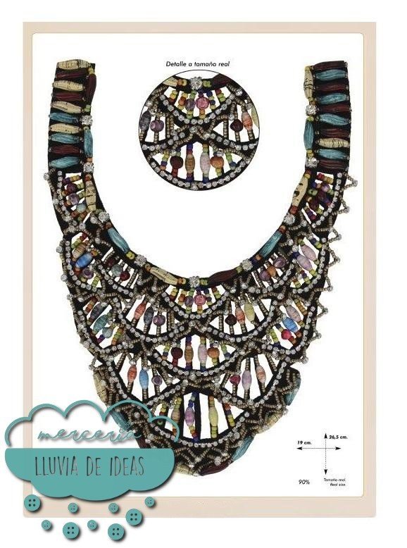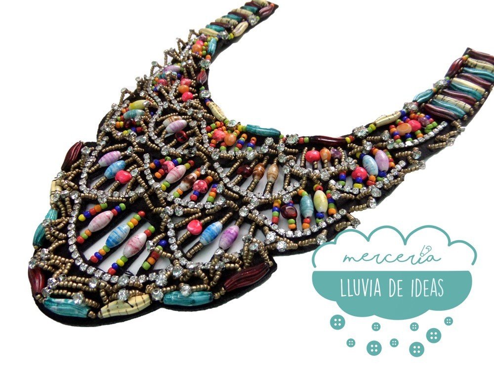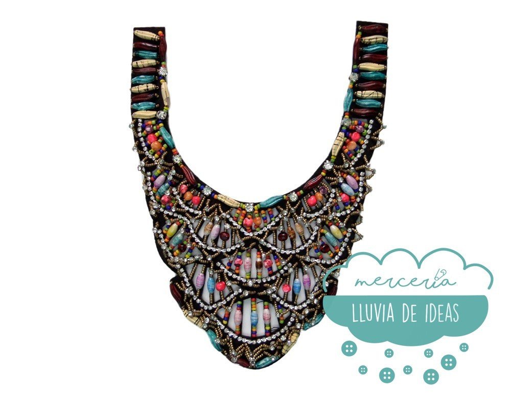 Cuello de rocalla con cristales y abalorios ideal para decorar cualquier tipo de tejido en camisas, camisetas, vestidos, etc. Muy empleado en kaftanes para primavera/verano.