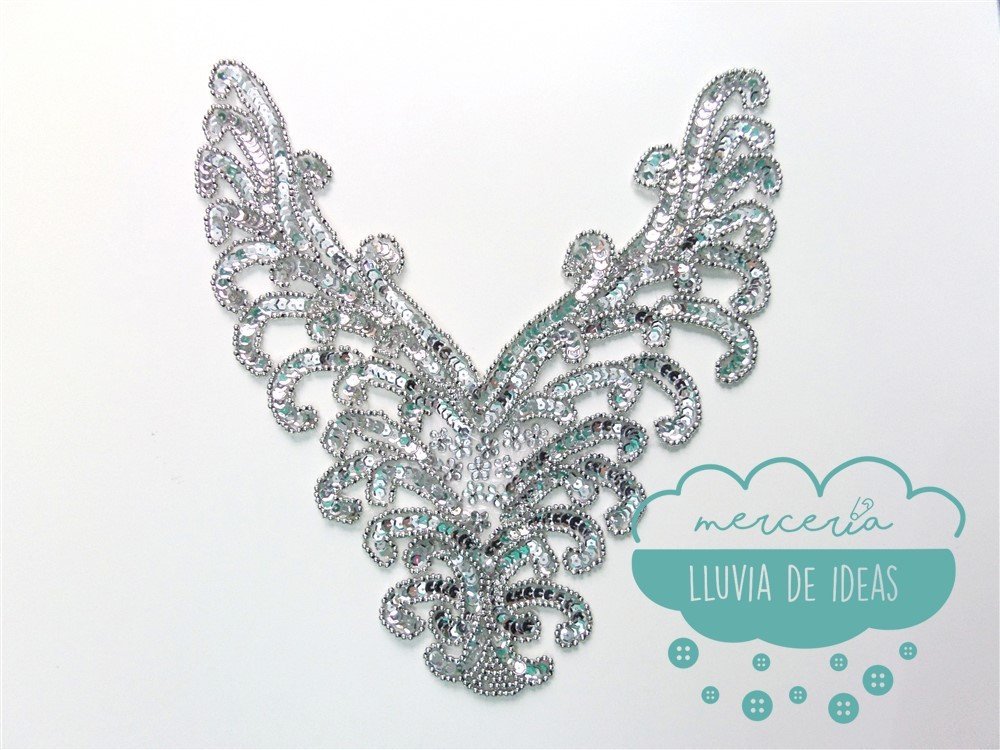 Aplicación de lentejuelas y rocalla. Referencia: X24. La base de la aplicación es un tul. Medida: ancho 28 cm. x alto 29 cm. aprox. El precio se refiere a la unidad.