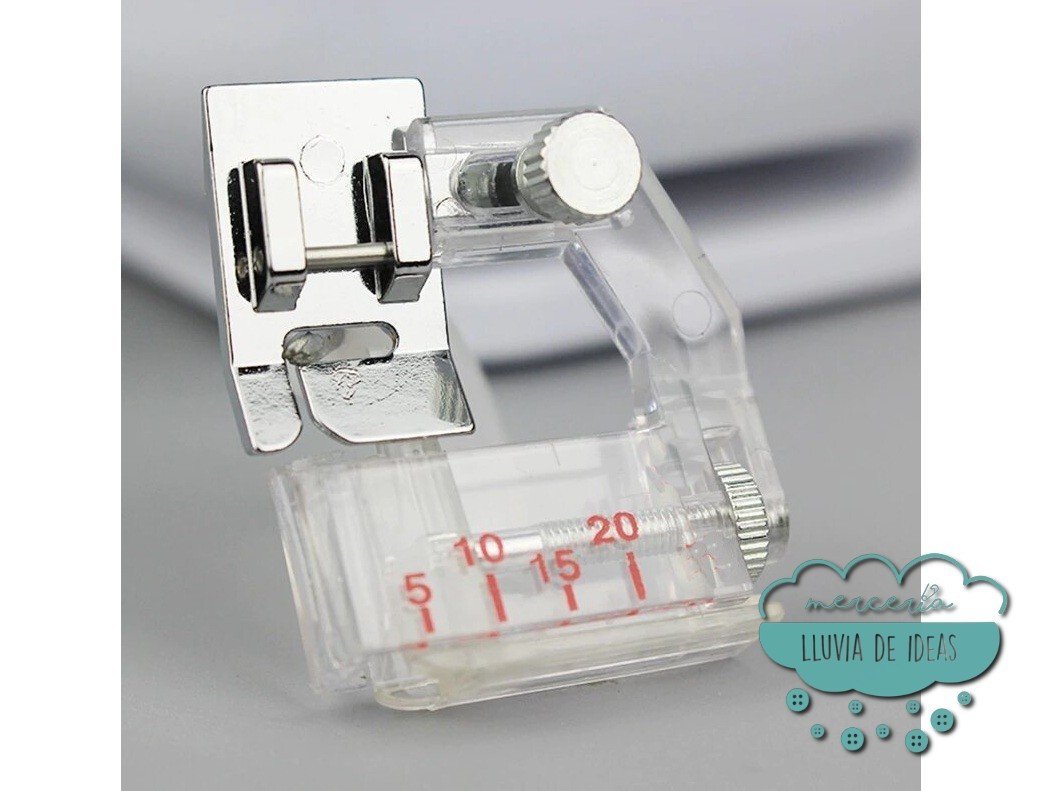 Podrás colocar un bies sin puntadas o hilvanes previos, en una sola pasada. Contiene una ruleta delantera que nos permitirá ajustar la posición al ancho del bies ya doblado y un tornillo trasero que al aflojarlo nos permite mover la parte plástica del prensatelas hacia los lados y así regular la posición de la puntada al borde del bies. En el interior de la pieza plástica vienen unos bordes que hacen de tope para que el bies quede bien centrado y alineado.