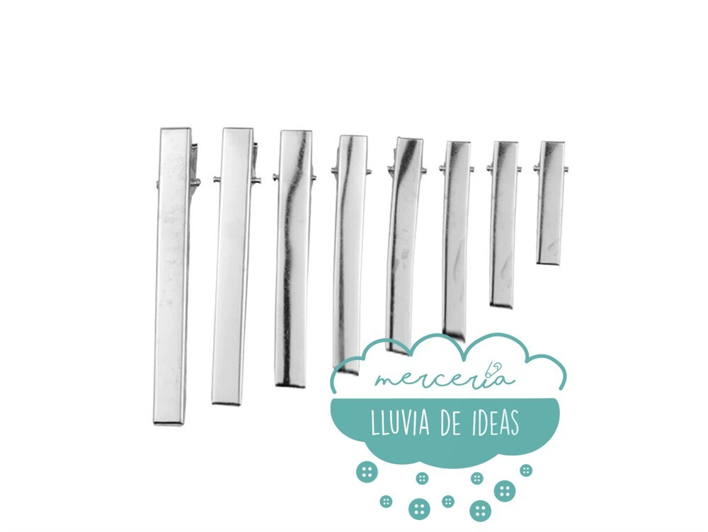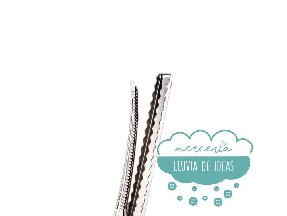 Pinzas para el pelo de cocodrilo o también llamadas de pico de plato plano dentadas. Base plana. Se customiza su superficie bien sea cosiendo la aplicación o lazo sobre su base o bien mediante pegamento.