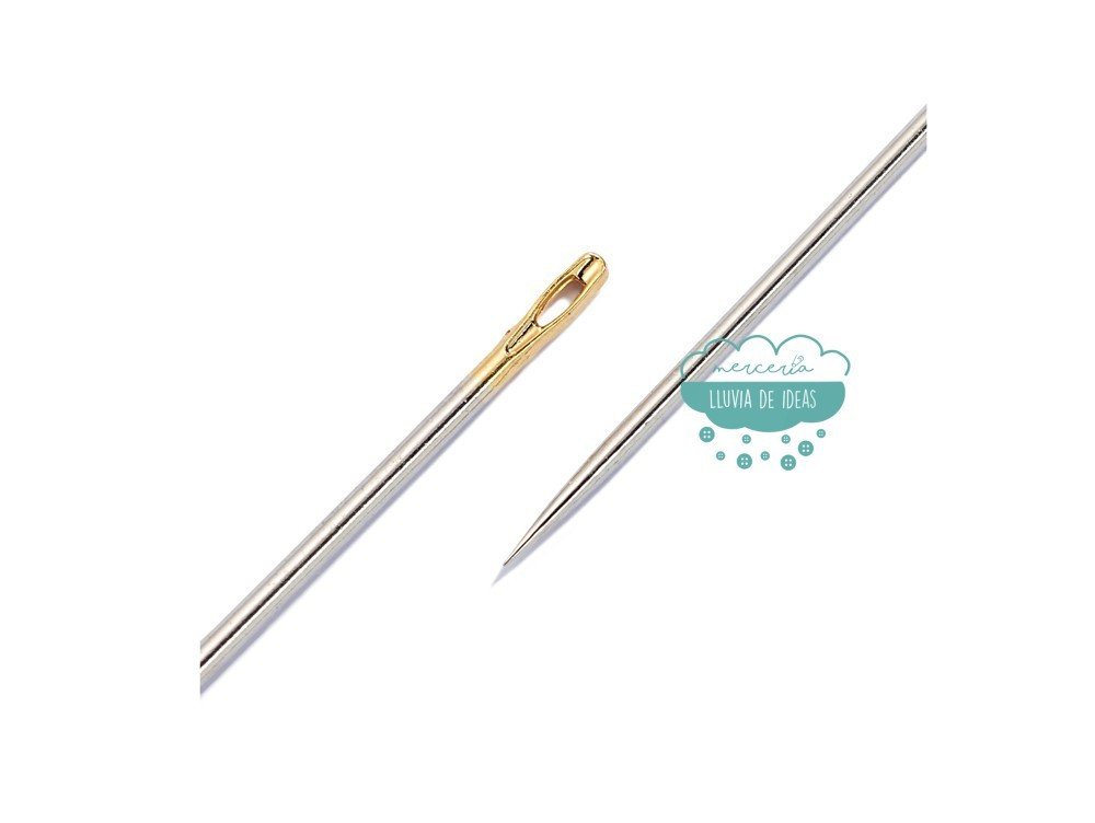Agujas de coser largas de medidas surtidas y grosores surtidos. Incluye 16 agujas de acero con ojo dorado surtidas del nº1 al 5 (siendo los grosores habituales de una aguja de coser del 1 más grueso al 10 más fino). Este tipo de agujas sirven para hilvanar, también para trabajos de decoración, para zurcir telas gruesas, etc.