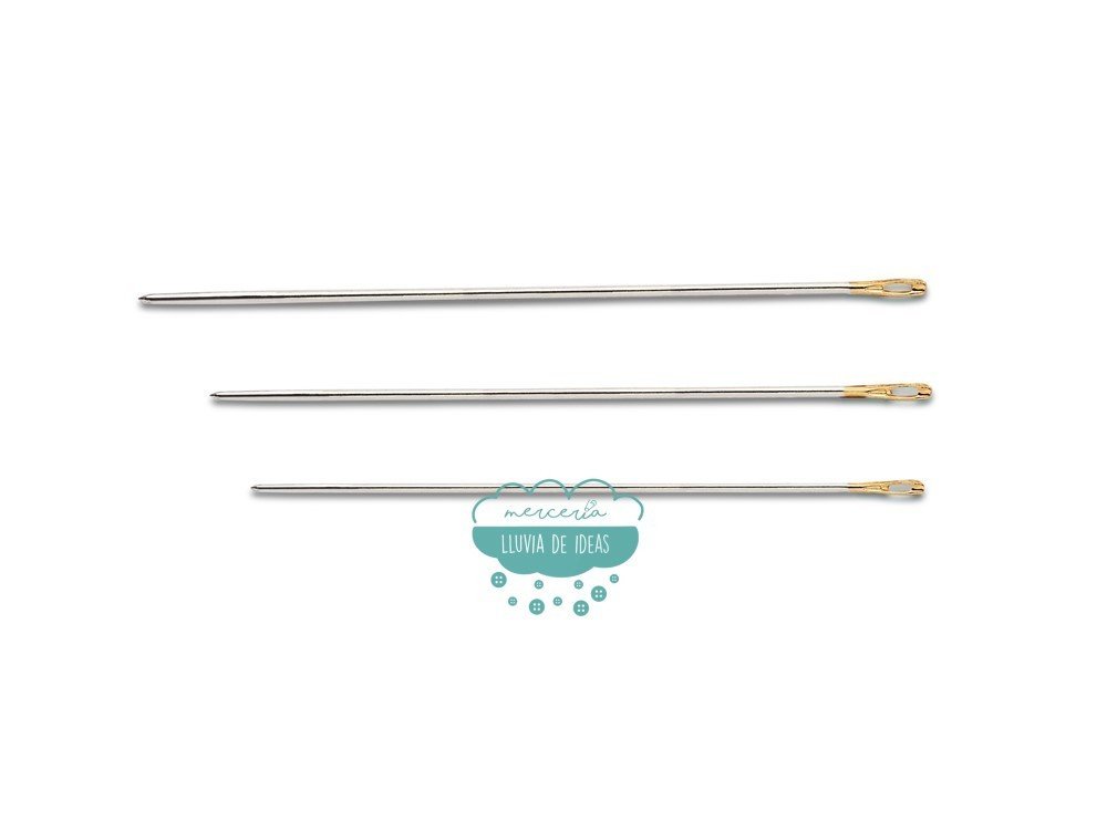 Agujas de coser a mano semi-largas con punta de bola (no afilada) de medidas y grosores surtidos, especialmente indicadas para coser tejidos de punto. Incluye 10 agujas de acero con ojo dorado surtidas del nº5 al 9 (siendo los grosores habituales de una aguja de coser del 1 más grueso al 10 más fino). Referencia: 121820. Presentación en blíster. El precio se refiere a la unidad (set de 10 agujas).