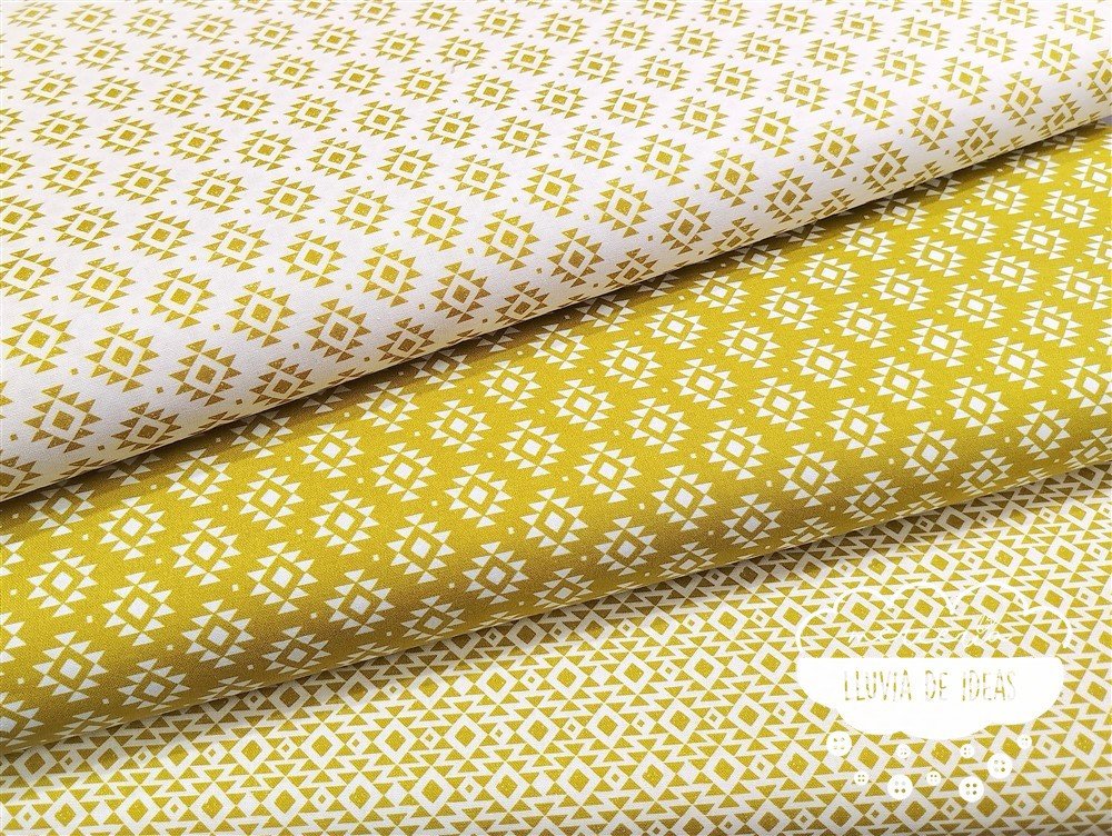 Tela de algodón estampado. Esta colección de algodón combina diferentes estampaciones geométricas coordinando un tono base con el color blanco. De tacto suave y agradable, resulta ser un tejido resistente y muy versátil. Ideal para proyectos de confección tanto en ropa en general (vestidos, faldas, camisas...), como en la creación de accesorios de moda o del hogar (neceseres, bolsas, porta documentos, cojines, etc.).