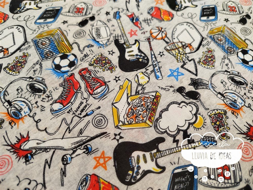 Tela de algodón con estampación de temática de deportes y música. El fondo del tejido es gris claro jaspeado. De tacto suave y agradable, resulta ser un tejido resistente y muy versátil. Ideal para proyectos de confección tanto en ropa infantil en general (vestidos, ranitas, peleles, camisas, baberos...), como en la creación de accesorios de bebé o del hogar (neceseres, baberos, bolsas de maternidad, porta documentos, cojines, etc.).