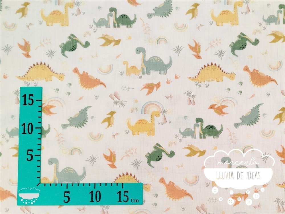 Tela muselina estampada con dinosaurios sobre fondo blanco. También conocida como bambula de algodón o doble gasa, cada capa se asemeja a la muselina (hilos gruesos y abiertos). Es vaporosa, con poco grosor, de tacto suave y ligera. Esta muselina añade un toque encantador y primaveral a cualquier proyecto o conjunto.