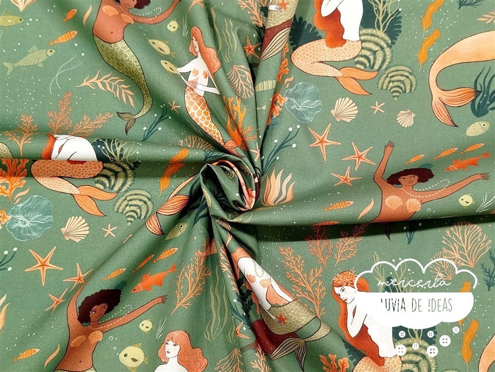 Tela de algodón estampado. Esta tela de algodón Sirenas combina sirenas, peces y corales sobre un fondo verde.  De tacto suave y agradable, resulta ser un tejido resistente y muy versátil. Ideal para proyectos de confección tanto en ropa en general (vestidos, faldas, camisas...), como en la creación de accesorios de moda o del hogar (neceseres, bolsas, porta documentos, cojines, etc.).