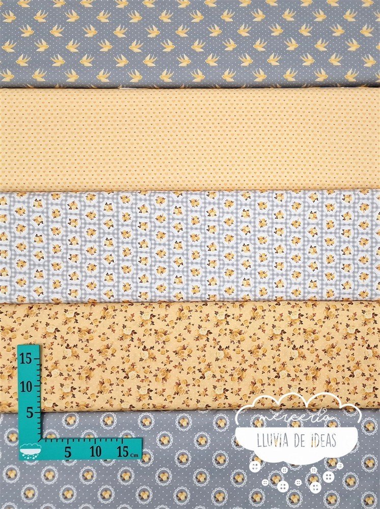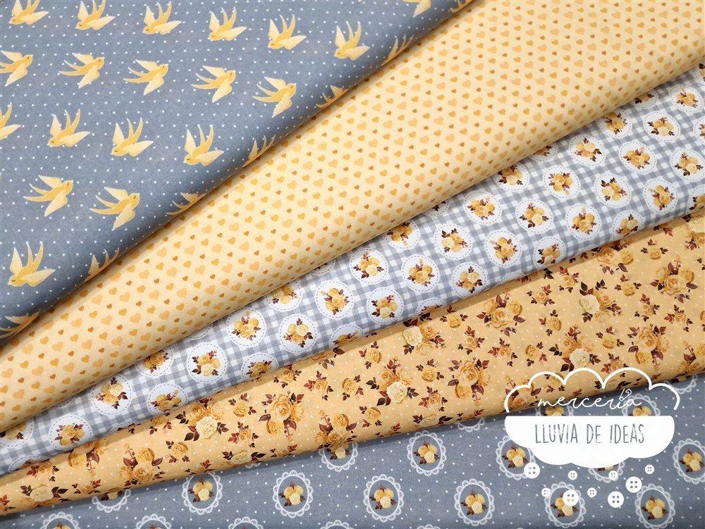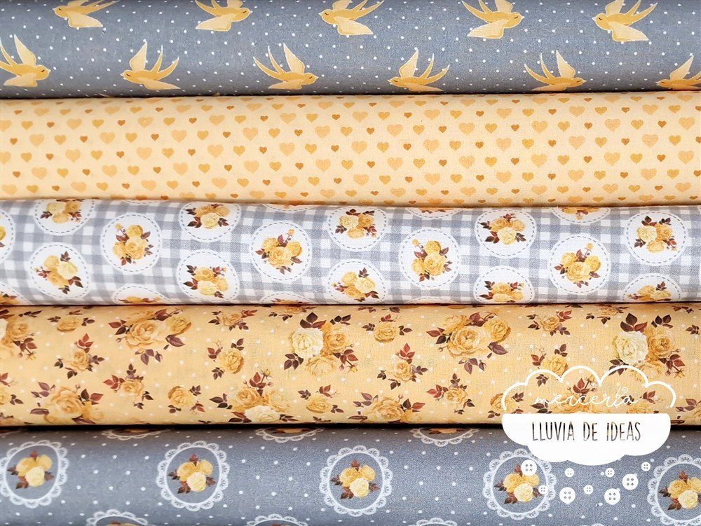 Tela de algodón estampado con 5 modelos diferentes que coordinan entre sí: un estampado de golondrinas y lunares, un estampado de corazones y 3 diseños florales de estilo romántico. De tacto suave y agradable, resulta ser un tejido resistente y muy versátil. Ideal para proyectos de confección tanto en ropa infantil en general (vestidos, ranitas, peleles, camisas, baberos...), como en la creación de accesorios de bebé (neceseres, baberos, bolsas de maternidad, porta documentos, cojines, etc.). También ideal para proyectos de confección de adulto (vestidos, faldas, camisas...) o en la creación de accesorios de moda o del hogar.