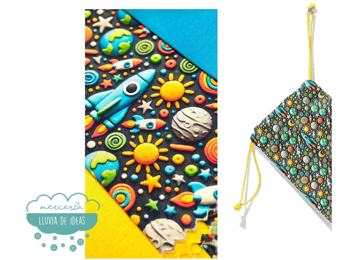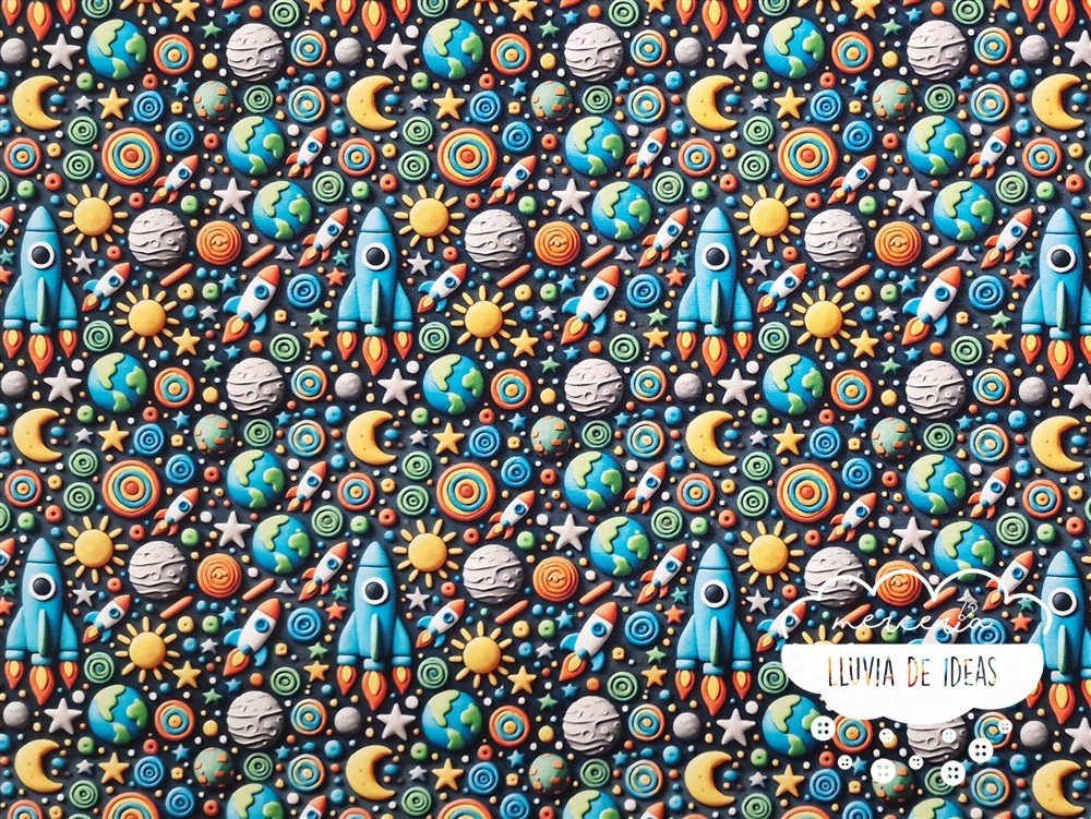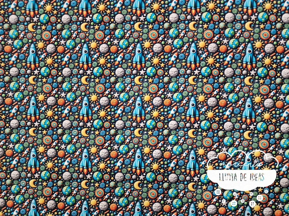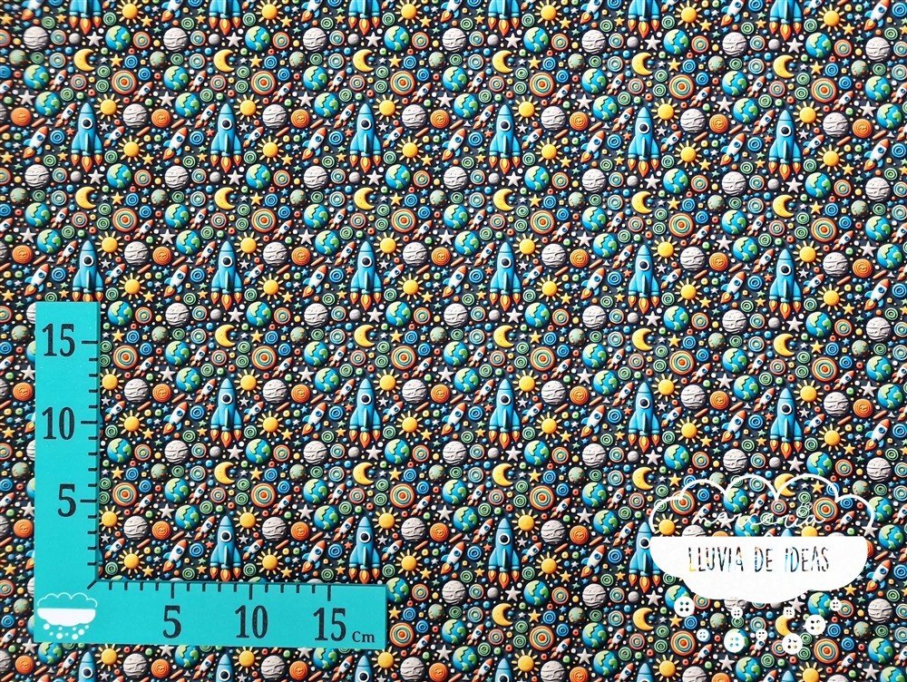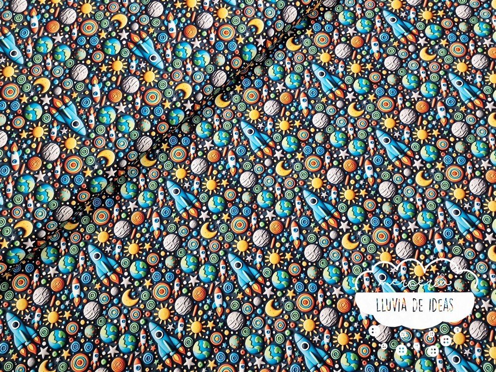 Tela de algodón con estampación digital de cohetes, planetas, estrellas, etc. multicolor sobre fondo negro con efecto 3D. El dibujo es tan realista que parece que las figuras toman volumen y salen del tejido. Resulta ideal para creaciones infantiles debido a su colorido y vistosidad. Podrás confeccionar proyectos originales que no pasarán desapercibidos, como bolsitas de merienda, estuches, mochilas, customizar prendas o crear complementos para vestir.