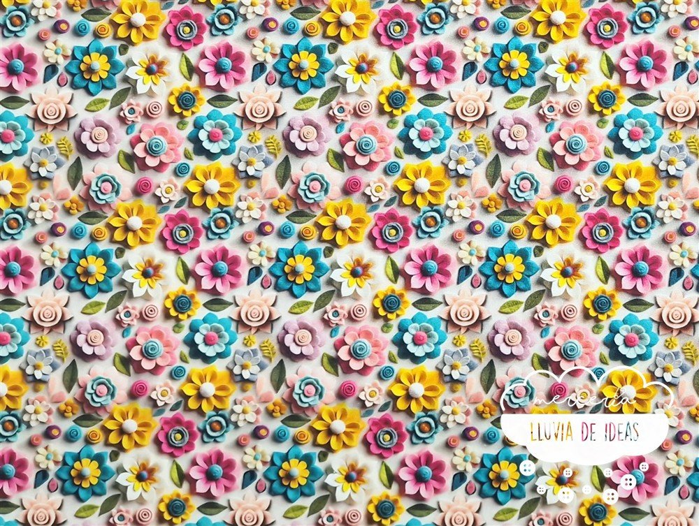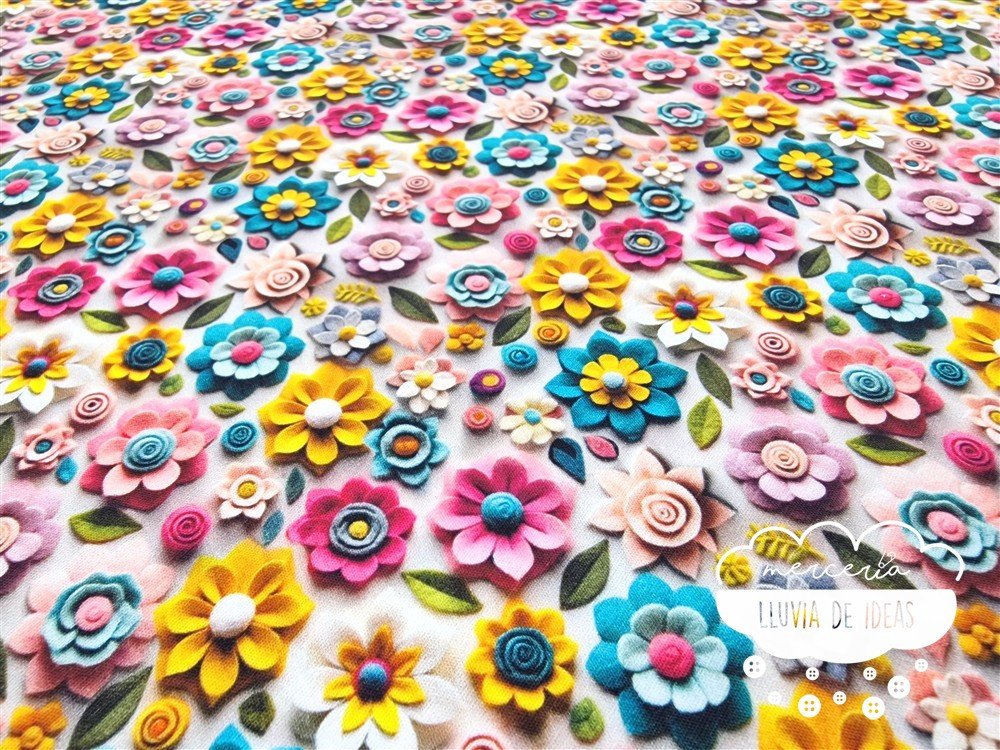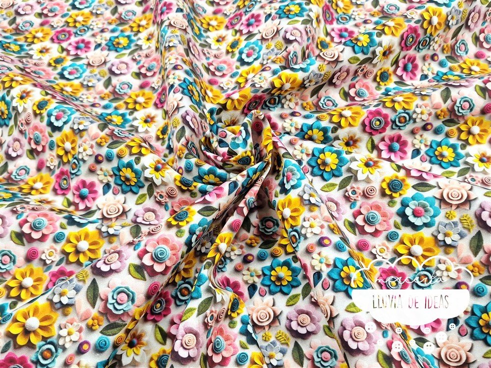 Tela de algodón con estampación digital de flores multicolor con efecto 3D. El dibujo es tan realista que parece que las figuras toman volumen y salen del tejido. Podrás confeccionar proyectos originales que no pasarán desapercibidos, como bolsitas de merienda, estuches, mochilas, customizar prendas o crear complementos para vestir. Su efecto tridimensional unido a su estampación digital, hacen que se produzca un efecto relieve y que los colores sean vibrantes y nítidos. De tacto suave y agradable, este algodón 3D resulta ser un tejido resistente y muy versátil.