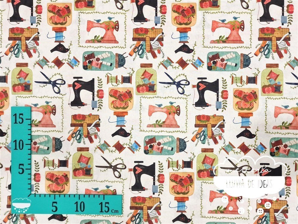 Tela de algodón estampado Costura. La estampación de este modelo consta de máquinas de coser, tijeras y otros accesorios de costura. De tacto suave y agradable, resulta ser un tejido resistente y muy versátil. Ideal para proyectos de confección tanto en ropa infantil en general (vestidos, ranitas, peleles, camisas, baberos...), como en la creación de accesorios de bebé (neceseres, baberos, bolsas de maternidad, porta documentos, cojines, etc.). También ideal para proyectos de confección de adulto (vestidos, faldas, camisas, chalecos acolchados...) o en la creación de accesorios de moda o del hogar.