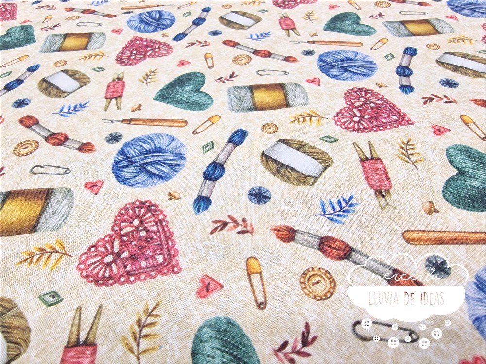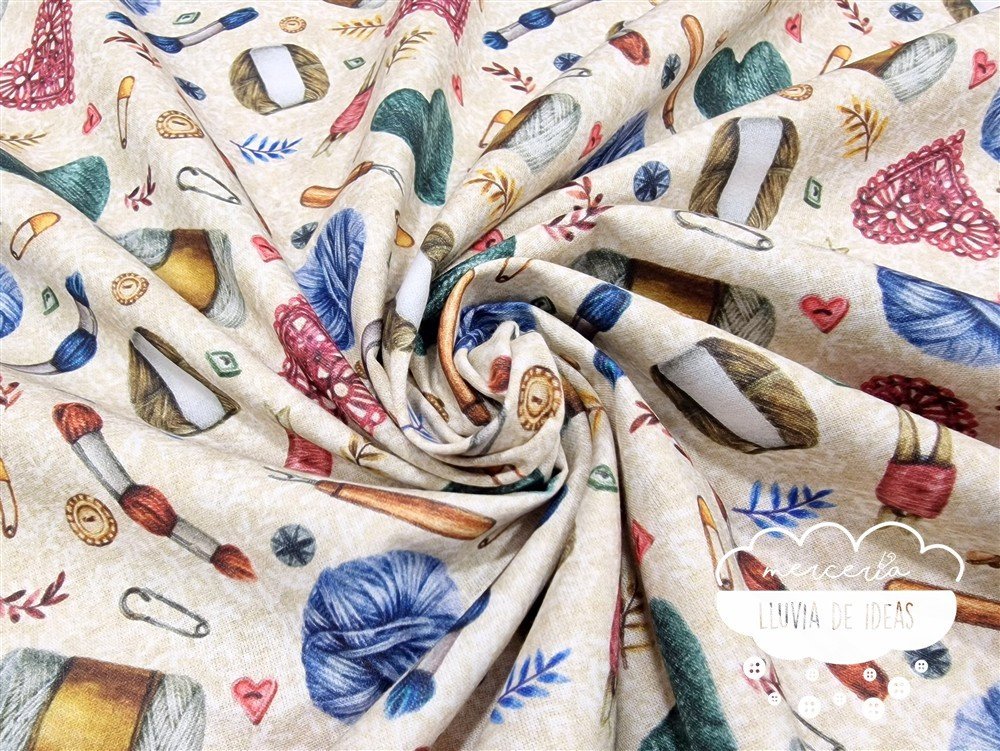 Tela de algodón estampado Tricot. La estampación de este modelo consta de madejas, ovillos, botones, imperdibles, descosedores, etc. De tacto suave y agradable, resulta ser un tejido resistente y muy versátil. Ideal para proyectos de confección tanto en ropa infantil en general (vestidos, ranitas, peleles, camisas, baberos...), como en la creación de accesorios de bebé (neceseres, baberos, bolsas de maternidad, porta documentos, cojines, etc.). También ideal para proyectos de confección de adulto (vestidos, faldas, camisas, chalecos acolchados...) o en la creación de accesorios de moda o del hogar.