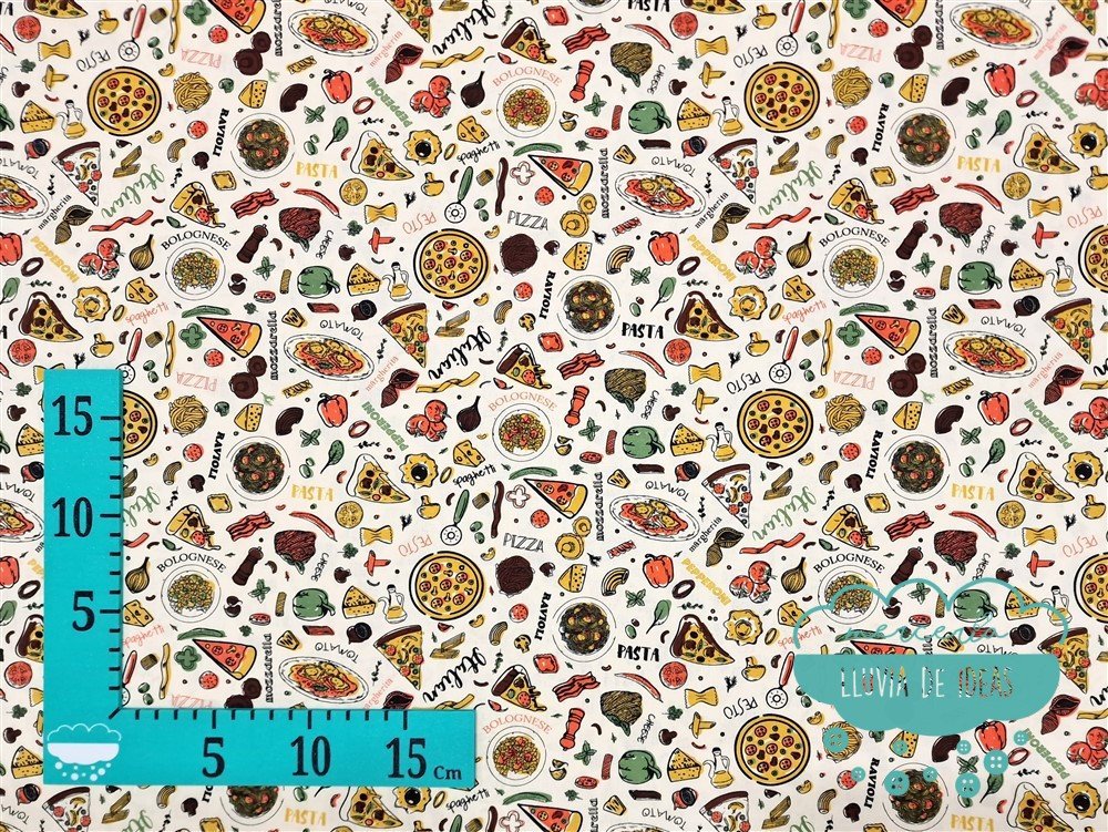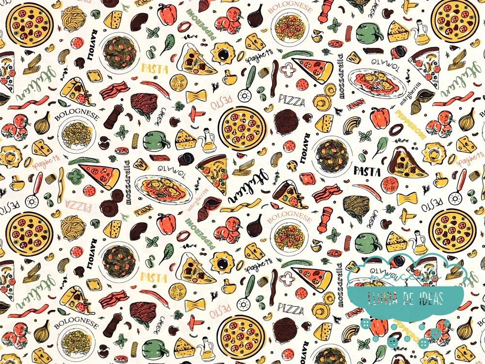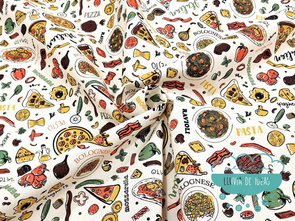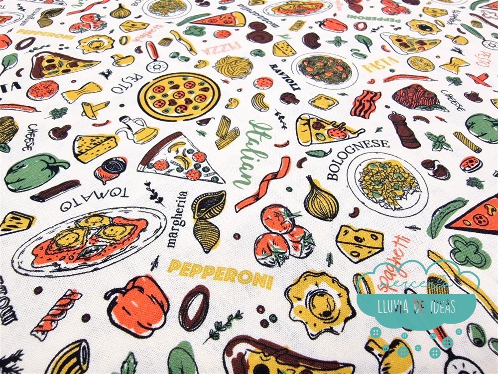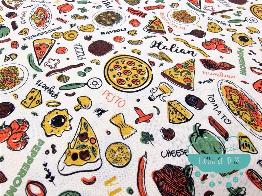 Tela de algodón estampado Pizza con productos de la gastronomía italiana, pizzas, pasta, etc. con fondo blanco roto/crudo. Es un tejido resistente y muy versátil. Ideal para proyectos de confección tanto en ropa en general (vestidos, faldas, camisas...), como en la creación de accesorios de moda o del hogar (neceseres, bolsas, porta documentos, cojines, etc.). Quedará precioso para un mantel.