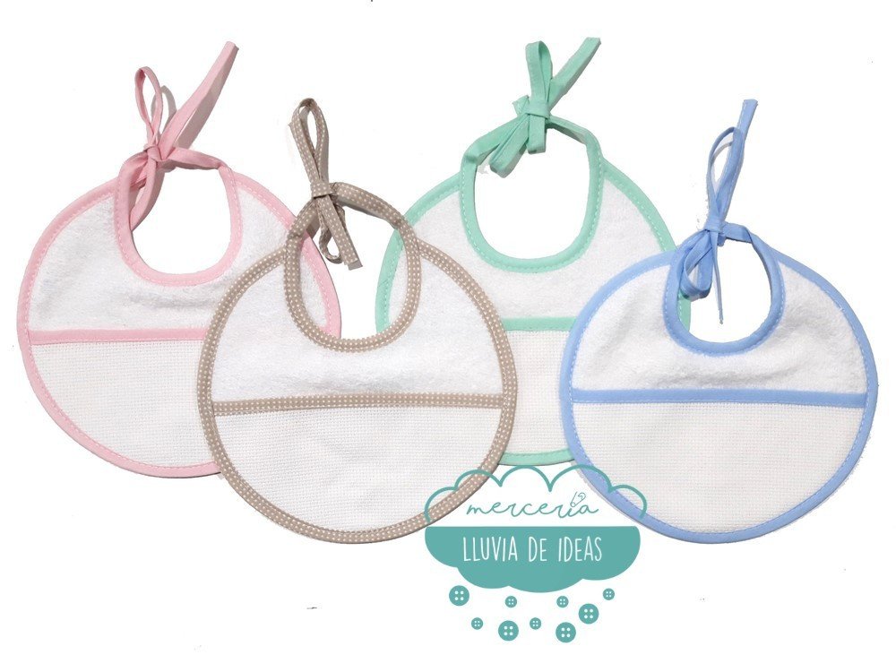 Babero de rizo redondo para bordar a punto de cruz el nombre del bebé.
