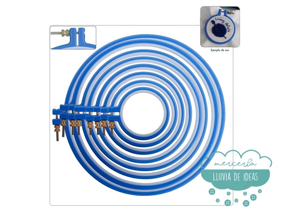 Bastidor de plástico redondo de doble aro. Incluye tornillo para tensar el tejido y reborde interior antideslizante. Con cantos redondeados.