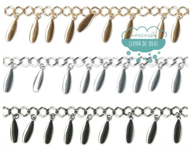 Cadena de acero con detalles tipo lágrima. Referencia: 825004. Libre de níquel. Medida: alto total de 34 mm. aprox. Alto de la cadena: 8 mm. aprox. Tamaño de la lágrima: ancho 7 mm. x alto 23 mm. aprox. El precio se refiere al metro.