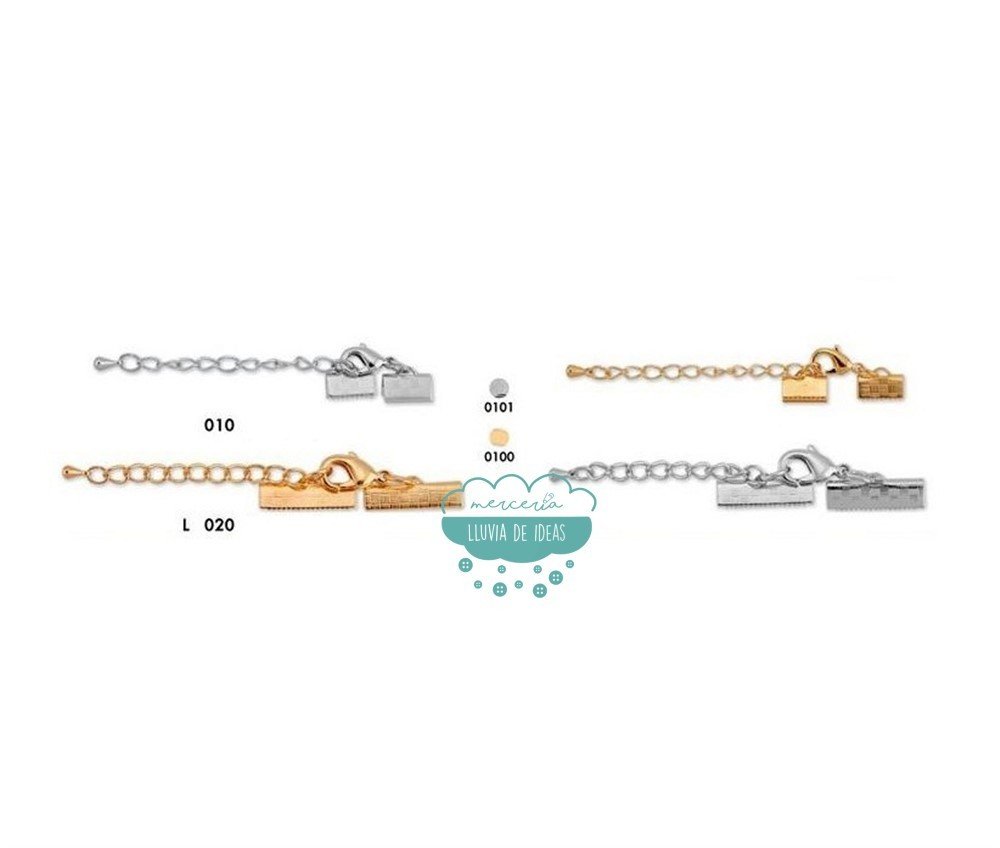 Terminales tipo grapa que incluyen cadena de seguridad para alargar con extremo que acaba en gota y mosquetón para cerrar.