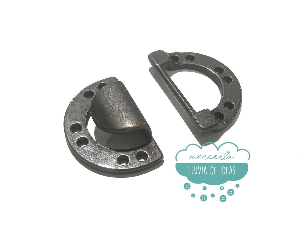 Cierres redondo tipo gancho con formas redondeadas. Empleados principalmente para cerrar abrigos, chaquetas y otras prendas que no contienen ojales. También indicados en cierres de bolsos donde el tejido permita la costura. Con agujeros para que sea posible la costura. Referencia: 721008. Tamaño total de las dos piezas unidas: ancho 32 mm. x alto 7 mm cm. aprox. El precio se refiere a la unidad ( dos piezas necesarias para el cierre).