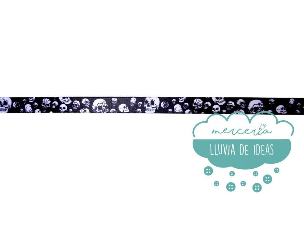 Cinta de raso o satén con estampación de calaveras. Ancho 16 mm. aprox. Composición: 100% poliéster.