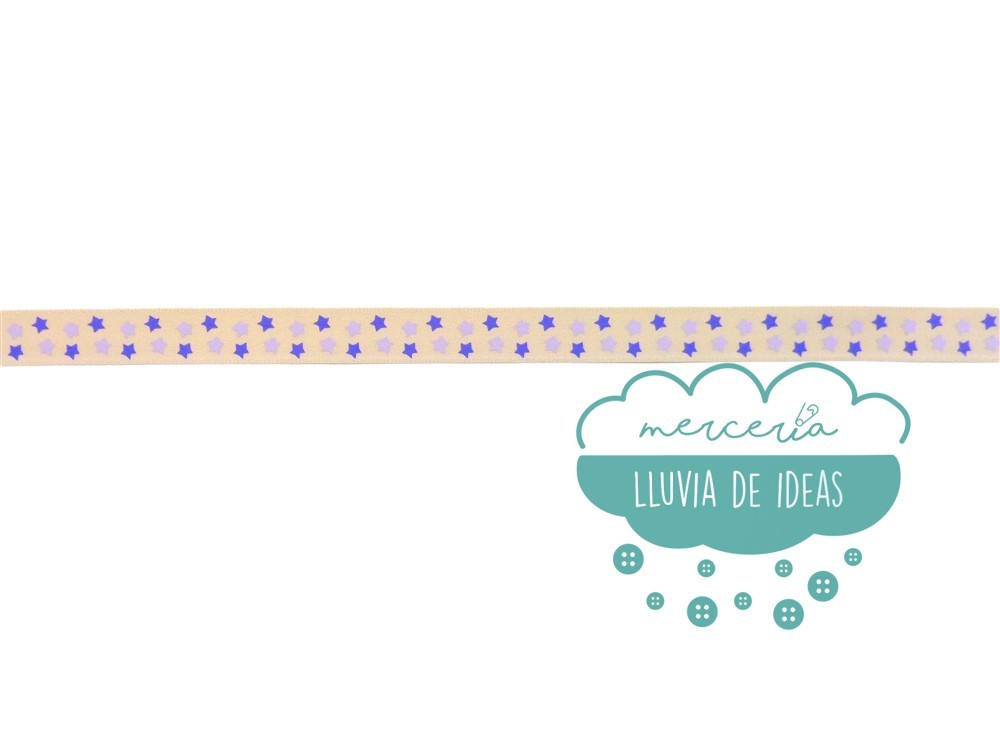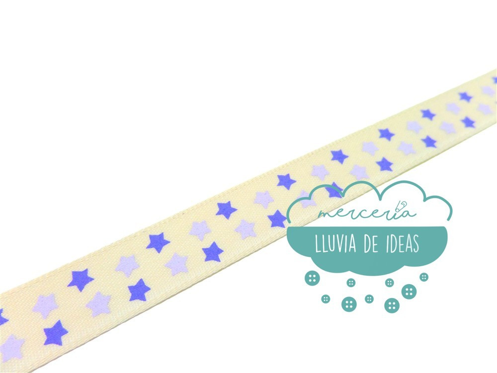 Cinta decorativa estampada con estrellas azules en dos tonos. Ancho 16 mm. aprox. Composición: 100% poliéster. Referencia: P150. Empleada en decoración de regalos, bodas, manualidades - DIY, cabello, confección, etc. Aportan un toque rústico ya que el tejido y el tono son similares al lienzo moreno.