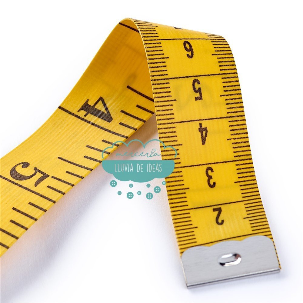 Centímetro o cinta métrica amarilla con escala en centímetros y pulgadas. Su mayor longitud permite tomar medidas en tallas grandes, ampliación de patrones u otros trabajos donde el largo de 150 cm. resulta escaso. De calidad gruesa. Incluye calotas metálicas.