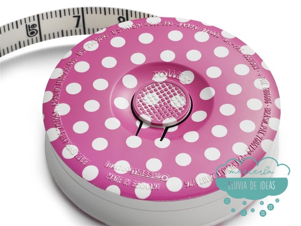 Cinta métrica empleada principalmente para costura. Muy práctica: gracias a su botón la cinta se enrolla rápidamente.