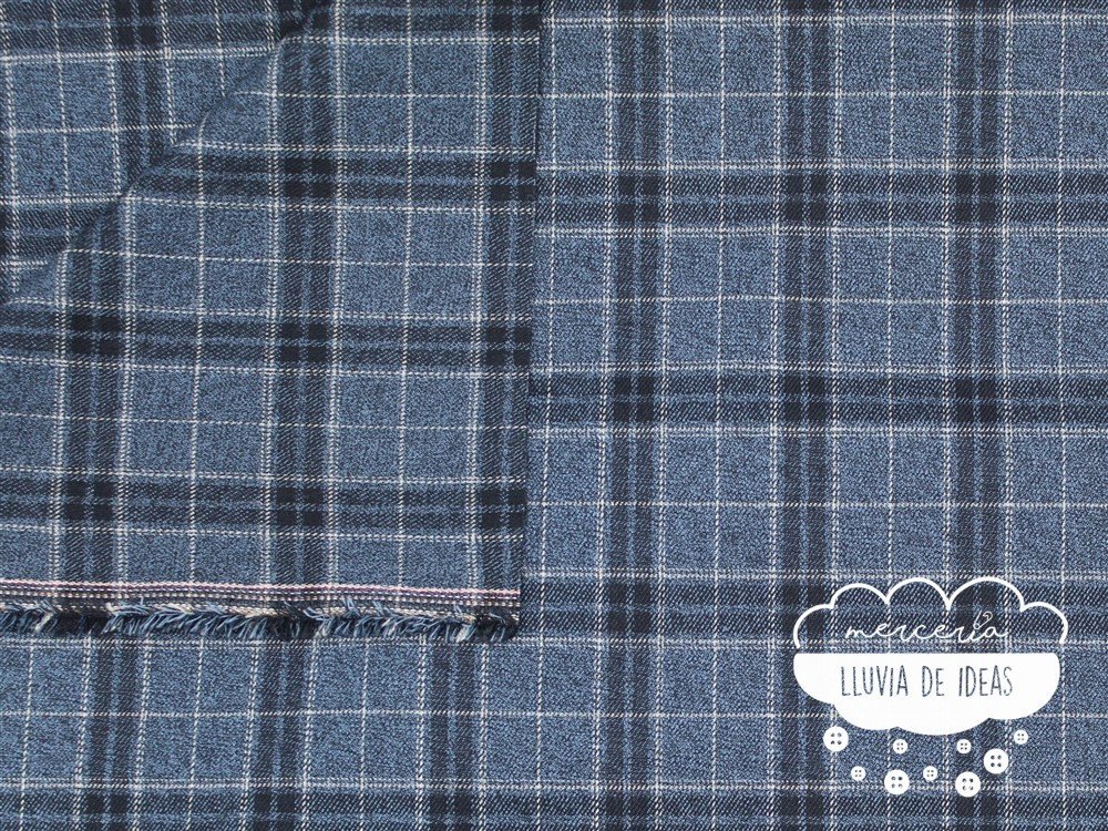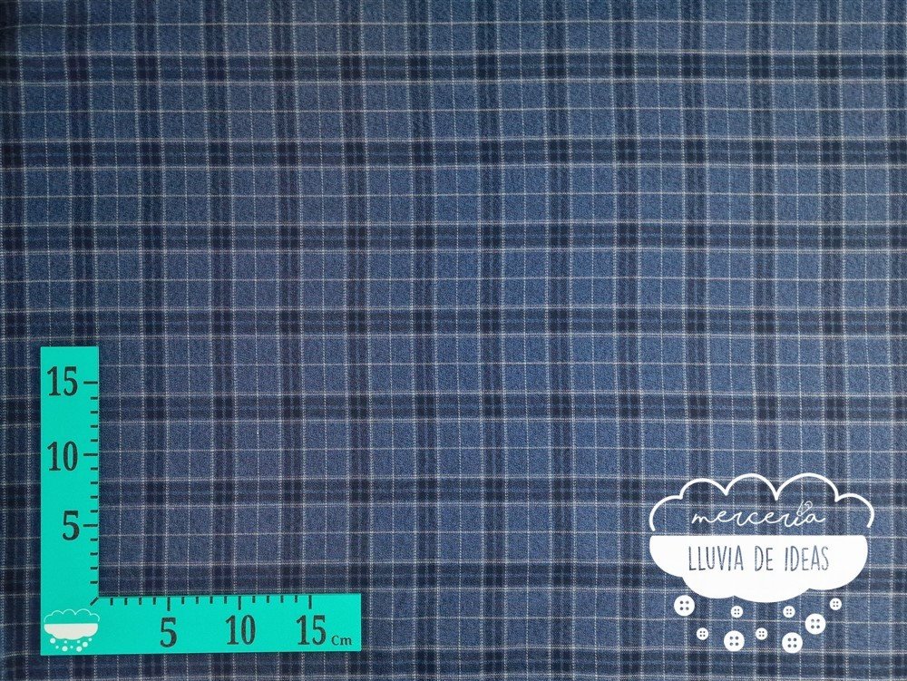 Tela de cuadros escoceses en fondo marino jaspeado. Estos cuadros son de corte clásico y atemporal, especialmente indicados para la confección de prendas y complementos para la temporada otoño/invierno, tanto de niños como de adultos. Con este tejido podrás crear faldas, pichis, vestidos, chaquetas o pantalones, ranitas para bebés, sacos si le añades un forro, etc. consiguiendo prendas muy funcionales y prácticas.