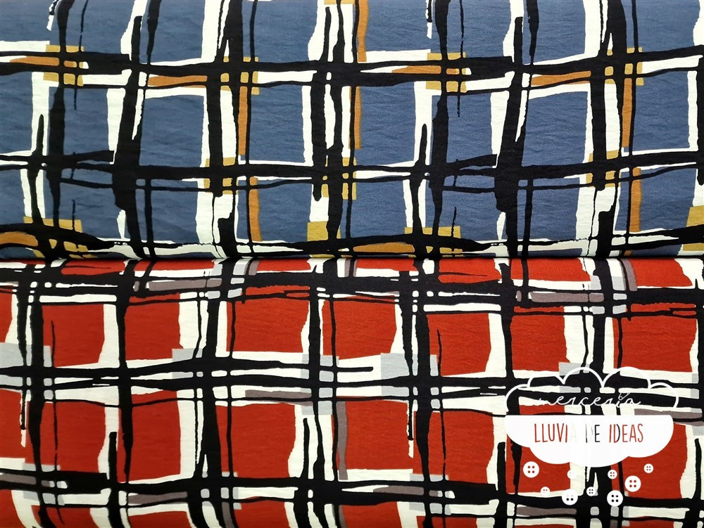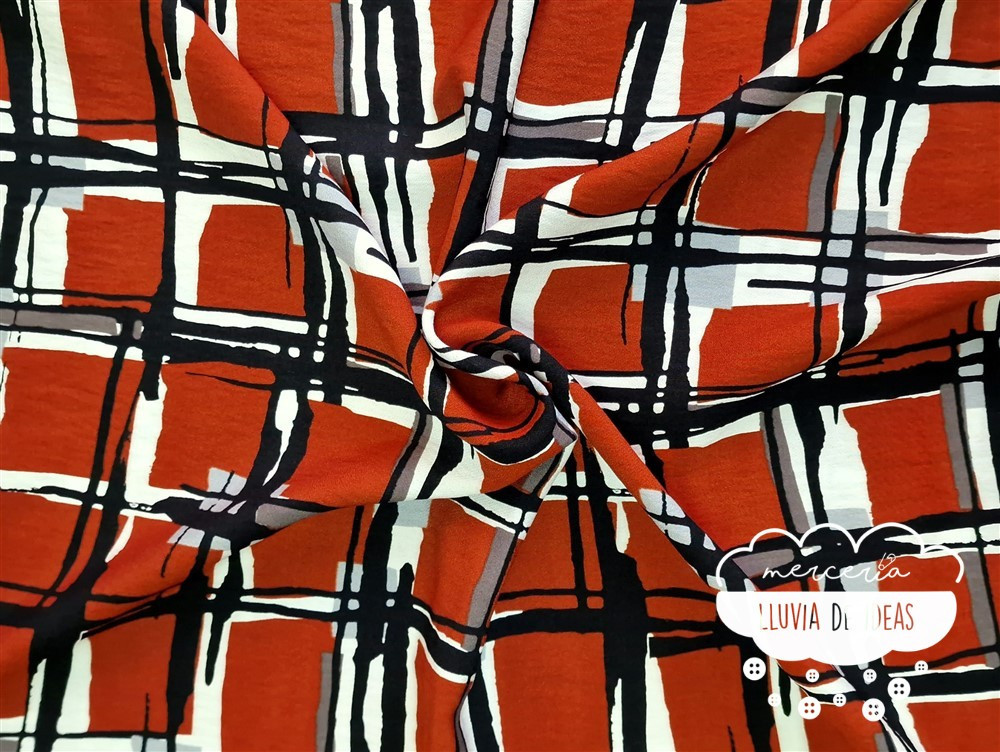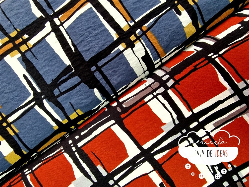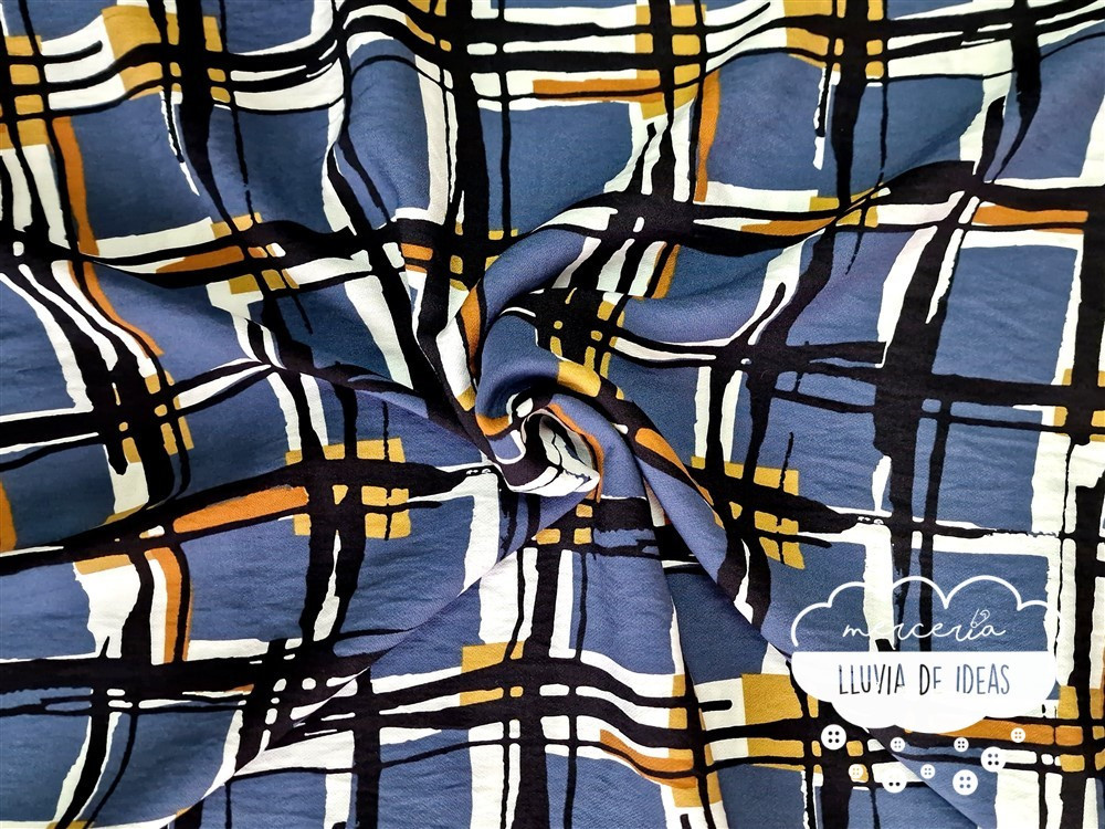 Crêpe viscosa estampado con forma de cuadrados efecto pintura con acuarela sobre fondo azul azafata o teja, para dar color a tus diseños, indicada para la confección de prendas de entretiempo para adultos. Podrás crear camisas, vestidos camiseros o con cortes, sobrecamisas o faldas, consiguiendo prendas fluidas, con muy buena caída y movimiento.