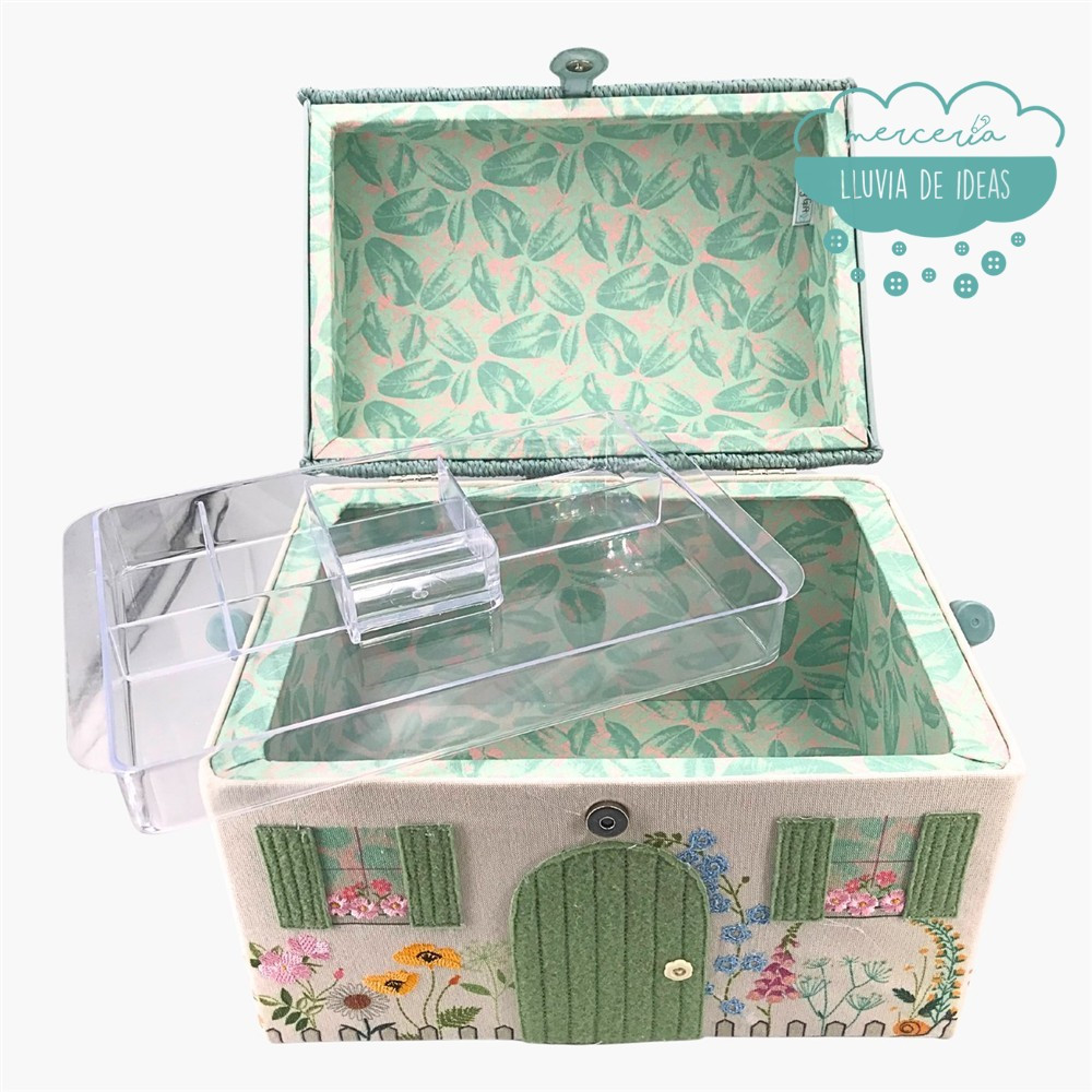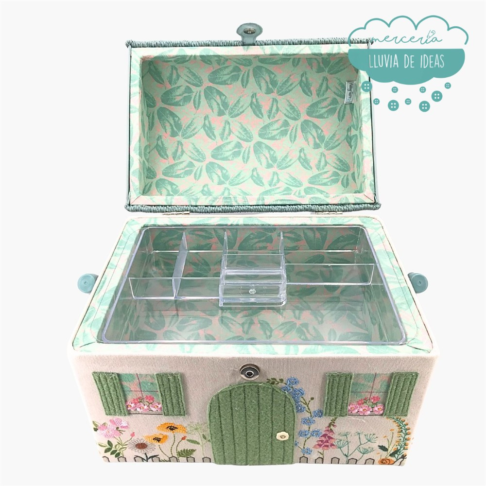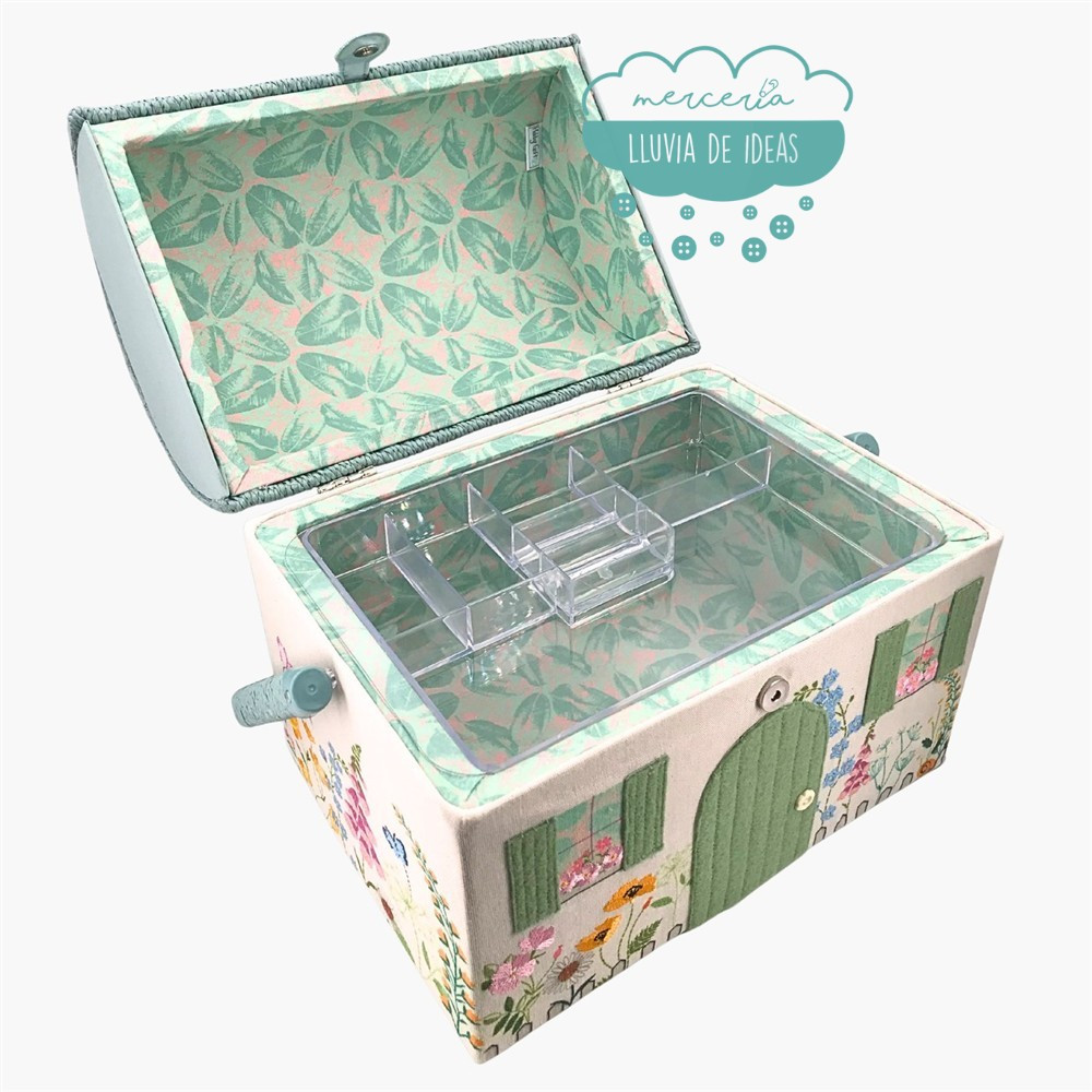 Además de su original diseño, su interior espacioso y la bandeja con compartimentos te permitirán guardar multitud  de accesorios como alfileres, agujas, hilos, botones, descosedor, etc. y pequeñas herramientas de costura o bordado.