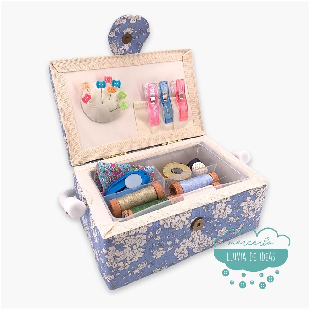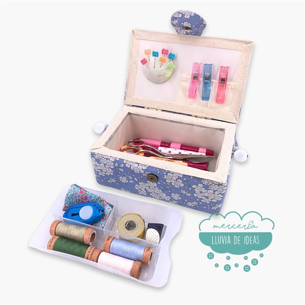 El costurero está confeccionado con un delicado estampado floral de fondo azul y flores blancas, que aporta un aire fresco, luminoso y elegante a cualquier rincón de costura. Su diseño decorativo hace que no solo sea práctico, sino también un elemento bonito para tener a la vista en tu espacio creativo.