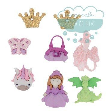 Botones decorativos con forma de los protagonistas de los cuentos clásicos. Ideales para scrapbooking, manualidades, patchwork, etc. Este modelo incluye 8 figuras de plástico: princesa, dragón, unicornio, bolso, mariposa con purpurina, todos ellos para coser por detrás, más 2 coronas con purpurina y 1 silueta de un vestido con percha, que se podría coser por encima o bien pegar con pegamento textil o silicona.