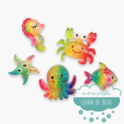 Añade un toque acuático y divertido a tu próximo proyecto de manualidades con estos botones decorativos (no se cosen) inspirados en animales del mar con un toque vibrante multicolor y purpurina en su interior. Cada botón es un animal diferente (caballito de mar, estrella, cangrejo, pulpo, pez), aportando colorido y diversión a tus proyectos de costura y manualidades.