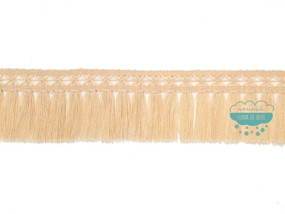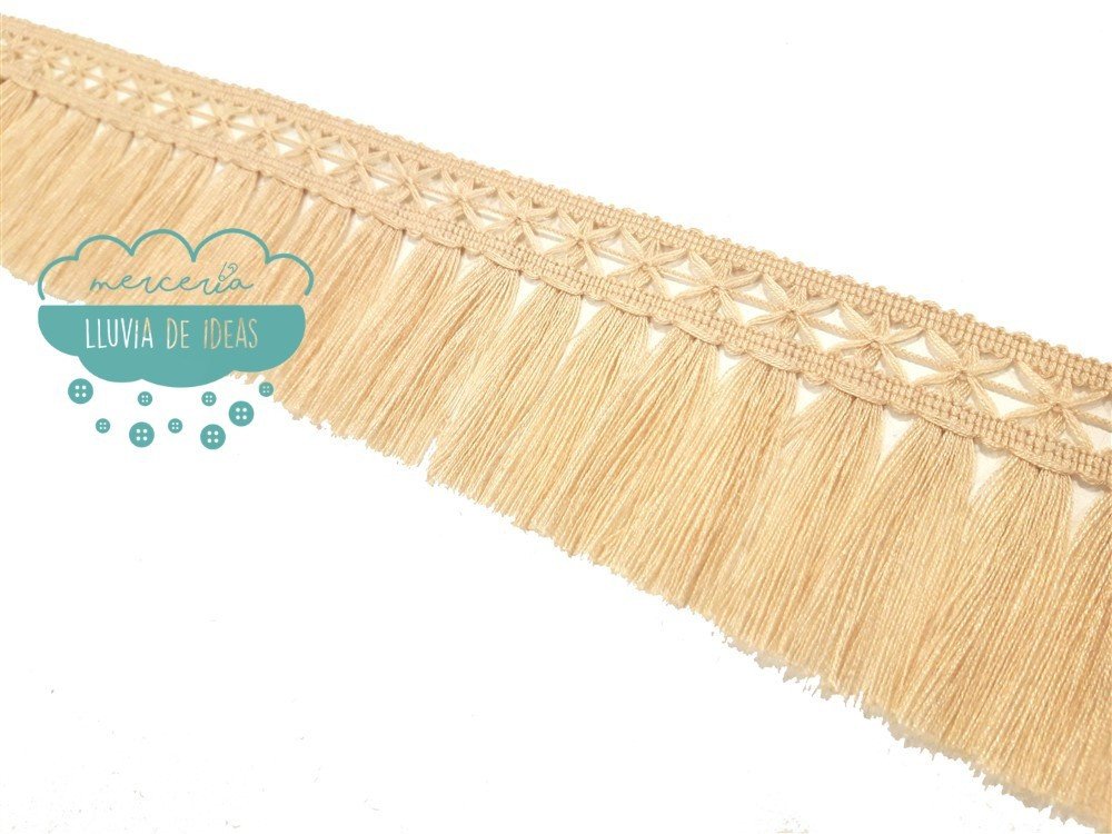 Fleco ideal para customizar vestidos, bolsos, capazos, cazadoras, botas, collares, etc. y manualidades artículos de marroquinería en general. También son un recurso muy empleado para alargar prendas que quedan cortas. Referencia: 154067.080. Composición: 100% acrílico. Largo total: 8 cm. aprox. El remate superior o enrejado tiene un ancho de 2,5 cm. aprox. Disponible en beige. Resto de colores por encargo. El precio se refiere al metro lineal. El corte mínimo son 0.25 m. y a partir de ahí, en incrementos de 5 cm. (0.30, 0.35, 0.40...).