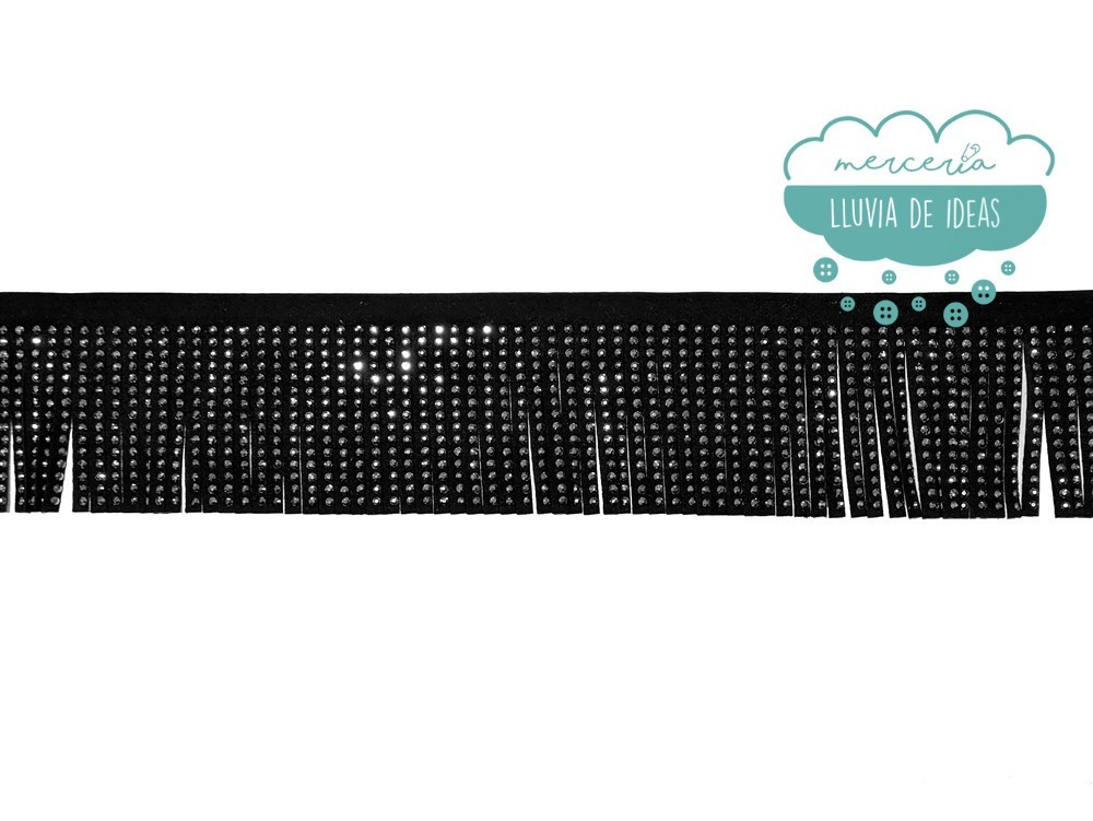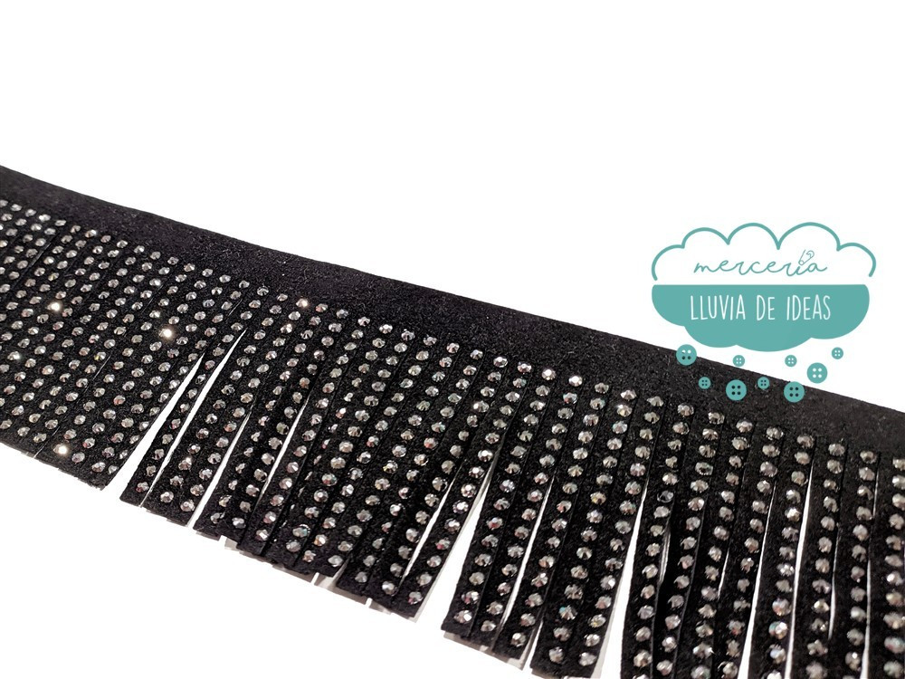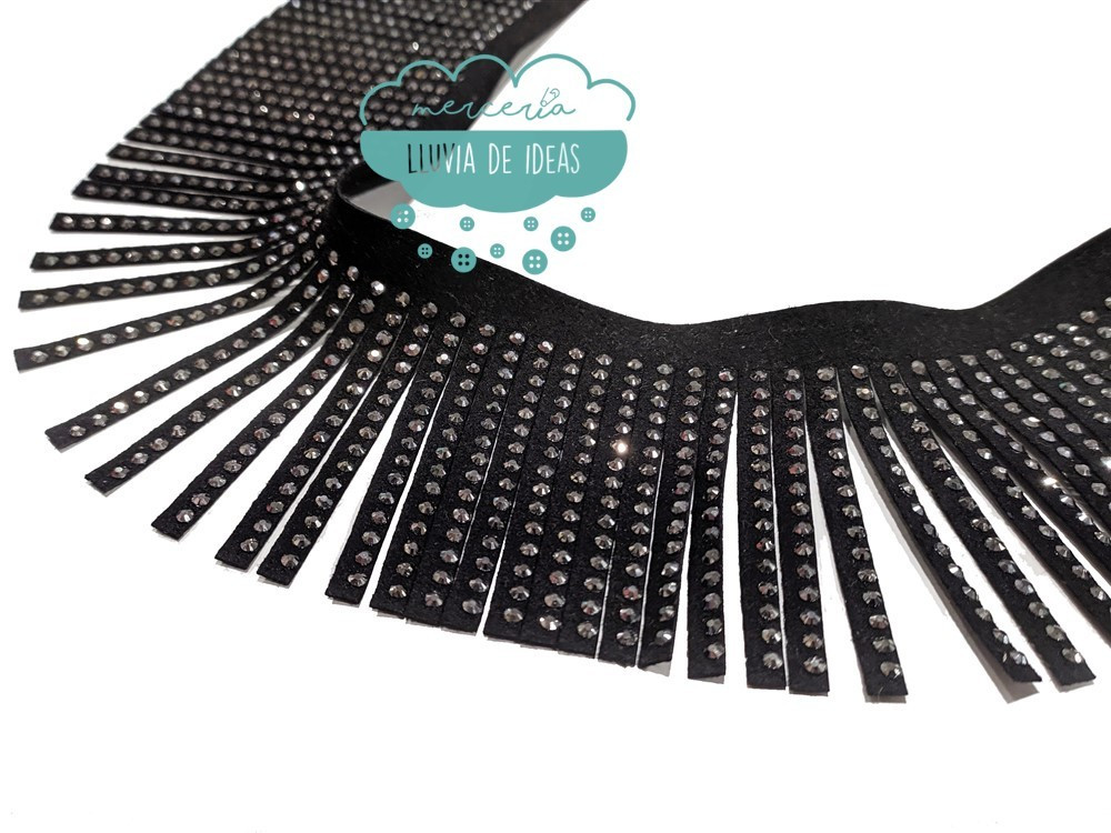 Fleco de antelina negra, decorado con tachas en color plata pavonado. Las tachas van colocadas en los flecos por una de sus caras. Ofrecen el efecto de strass (pequeños cristales) aportando vistosidad y elegancia a tus creaciones. También empleado para alargar prendas. Quedan genial en cazadoras, colocándose de puño a puño, a lo largo de toda la espalda y mangas. También en bolsos, creando diferentes capas superpuestas.