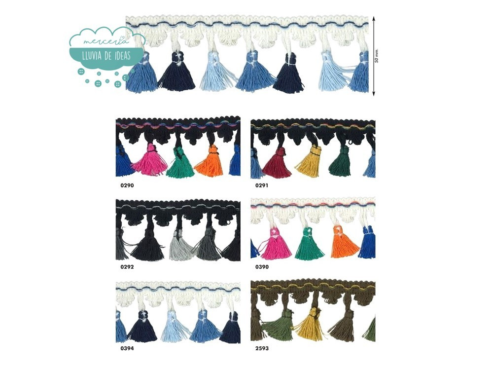 Tapacosturas en tono liso con algunos hilos de color (ancho 20 mm. aprox.) y borlas en varios colores (ancho 25 mm. aprox.).