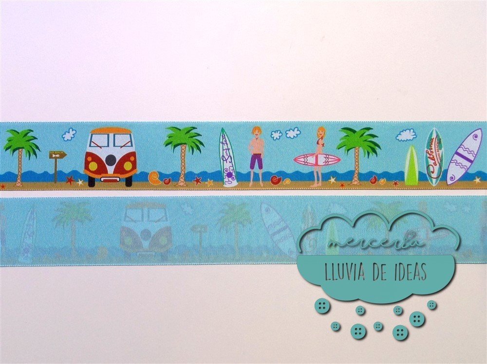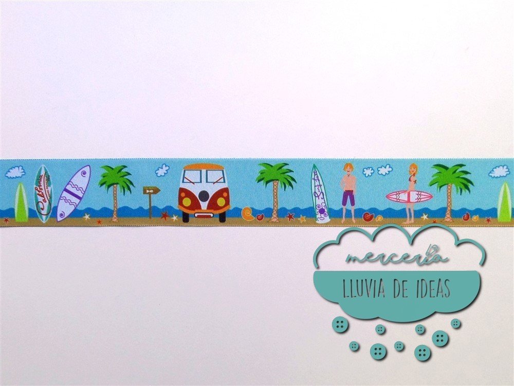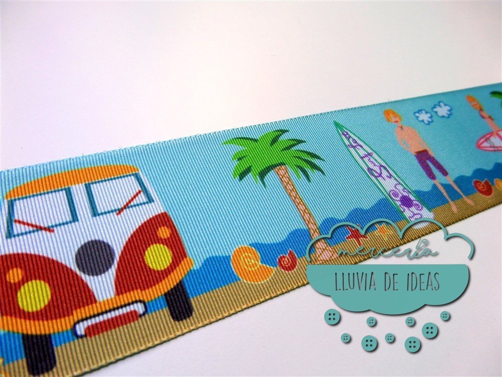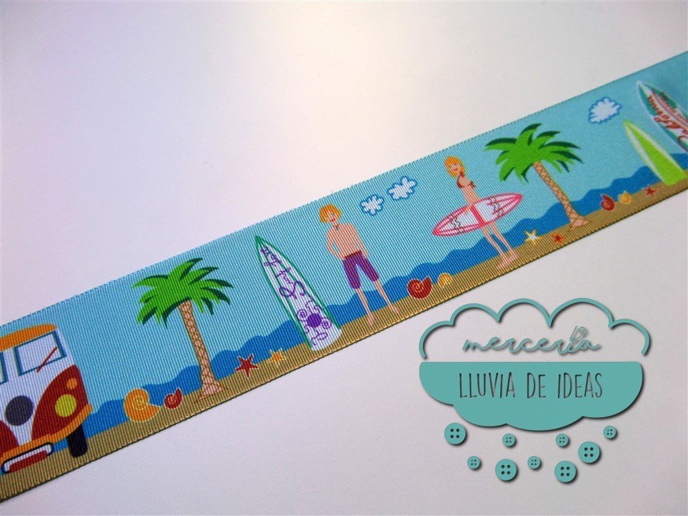 Cinta estampada a una cara. Cinta de falla, similar al grogré o gros-grain pero ligeramente con menos grosor. [Surf, caravanas, tablas, palmeras, mar]