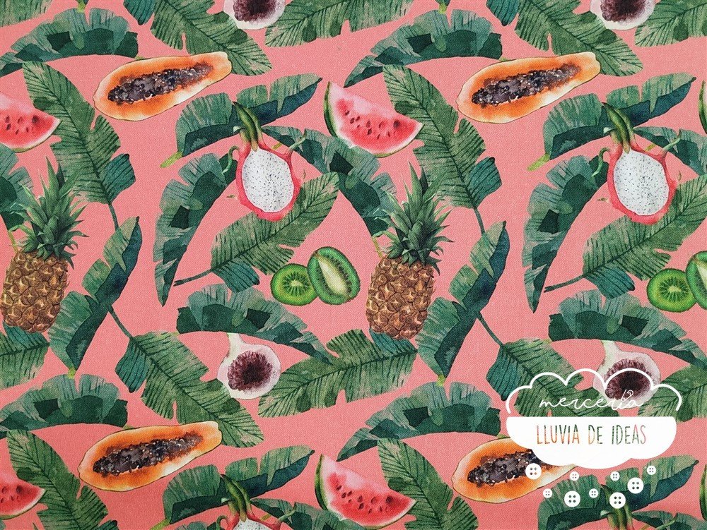 Half panamá con estampación digital de frutas y hojas tropicales en tonos vibrantes y llamativos. Gracias a su estampado conseguirás darle un toque único a todos tus proyectos. El half panamá es un tipo de tejido indicado para tapicería o mantelería con acabado tipo esterilla. También podría emplearse en confección de prendas y accesorios de moda. El hilo es grueso en ambas direcciones y no solo en una, como ocurre con la loneta.