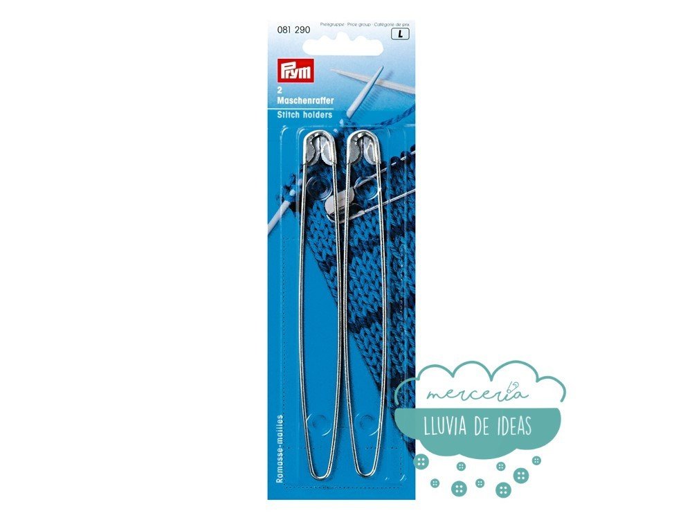 Guardapuntos o aguja imperdible plateados. Se emplean para guardar los puntos de la labor ya tejidos y dejarlos en espera con el fin de unir las diferentes piezas más tarde.