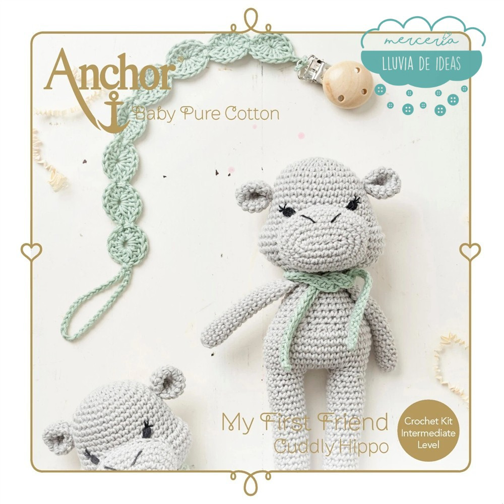 Kit de amigurumi Hipopótamo con el que podrás tejer este adorable hipopótamo para bebés. Anchor nos presenta este kit para confeccionar amigurumi llamado "Mi primer amigo: el tierno hipopótamo". Conseguirás una figura de amigurumi para bebé de unos 21 cm. aprox. de alto una vez finalizado y una cadena portachupetes a juego de unos 27 cm. aprox.