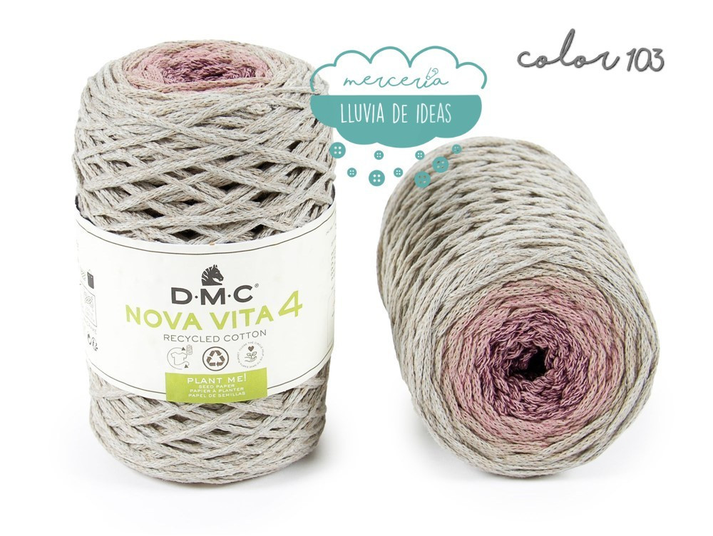 Nova Vita 4 Multicolor de la casa DMC es un hilo de algodón reciclado destinado a la decoración del hogar y complementos. Se puede trabajar con dos agujas, ganchillo o técnicas de macramé. Con él podrás confeccionar posavasos, cojines, alfombras, cestas, proyectos de macramé, pantallas de lámparas, cestas, bolsos, etc.