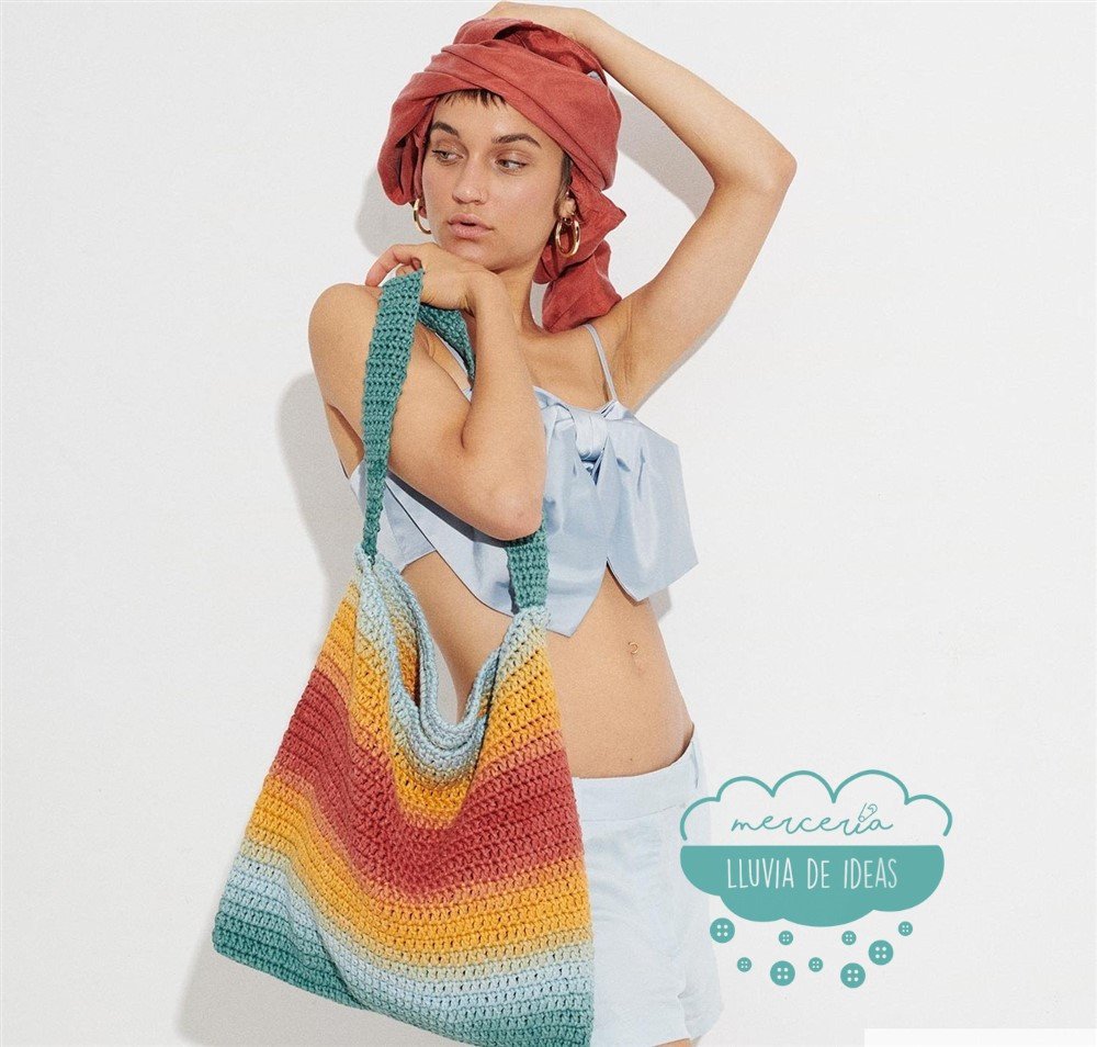 Con solo 1 o 2 ovillos, dependiendo del tamaño que desees, puedes tejer una práctica tote bag con un degradado simétrico con la que destacar a diario.  El asa también puede ir tejida con el mismo hilo o puedes reforzarlo cosiendo a la tote bag una cinta de algodón.