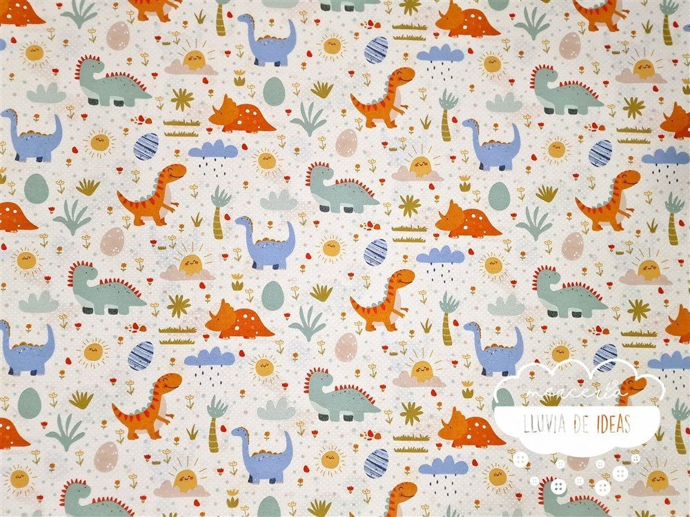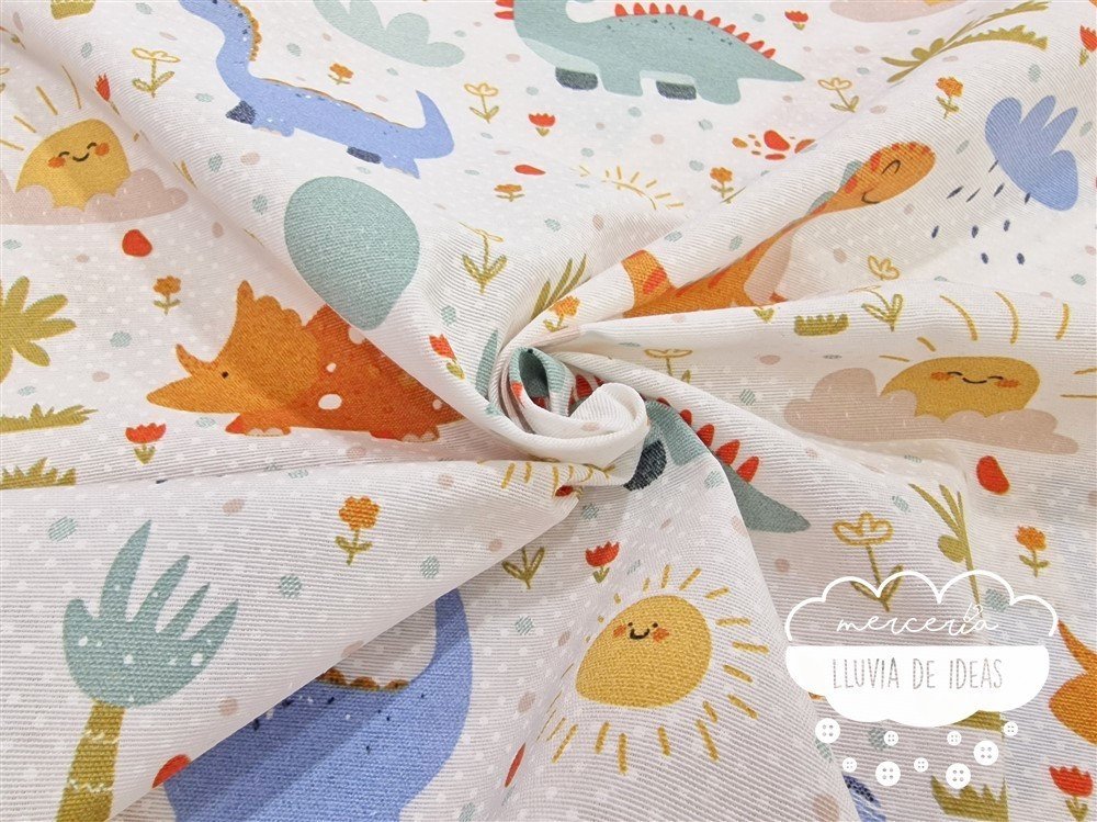 Loneta estampada con motivos de dinosaurios, soles,  combinando diferentes tonos y sobre un fondo de lunares blancos. Esta loneta infantil es ideal para tus proyectos de costura, tapicería, decoración del hogar como caídas o estores, mantelerías, cojines, etc.