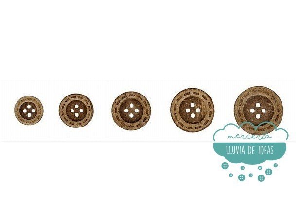 Botones de coco con borde de diferentes medidas con grabado que simula un pespunte alrededor del botón. Forma ligeramente cóncava. Con cuatro agujeros para coser.
