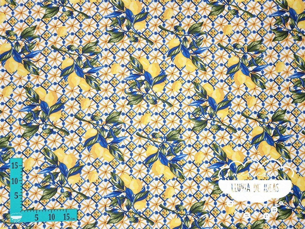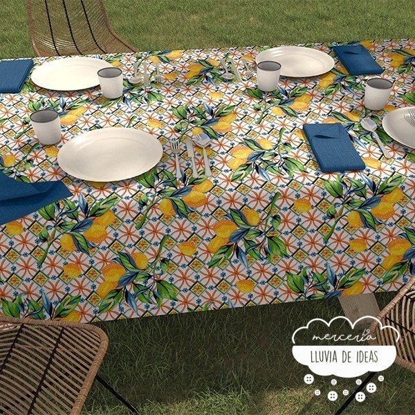 Tela resinada antimanchas con estampación de limones que recuerda a los azulejos portugueses. Mantelería antimanchas: la base del tejido es una loneta cuya superficie contiene un tratamiento de teflón, formando una superficie resinada que la convierte en un tejido antimanchas. Indicado para la confección de manteles, bolsas, fundas, delantales, etc. o en tapicería para exterior. Su capa resinada evita la absorción de líquidos y la convierte en repelente al agua y a las manchas por su cara superior.