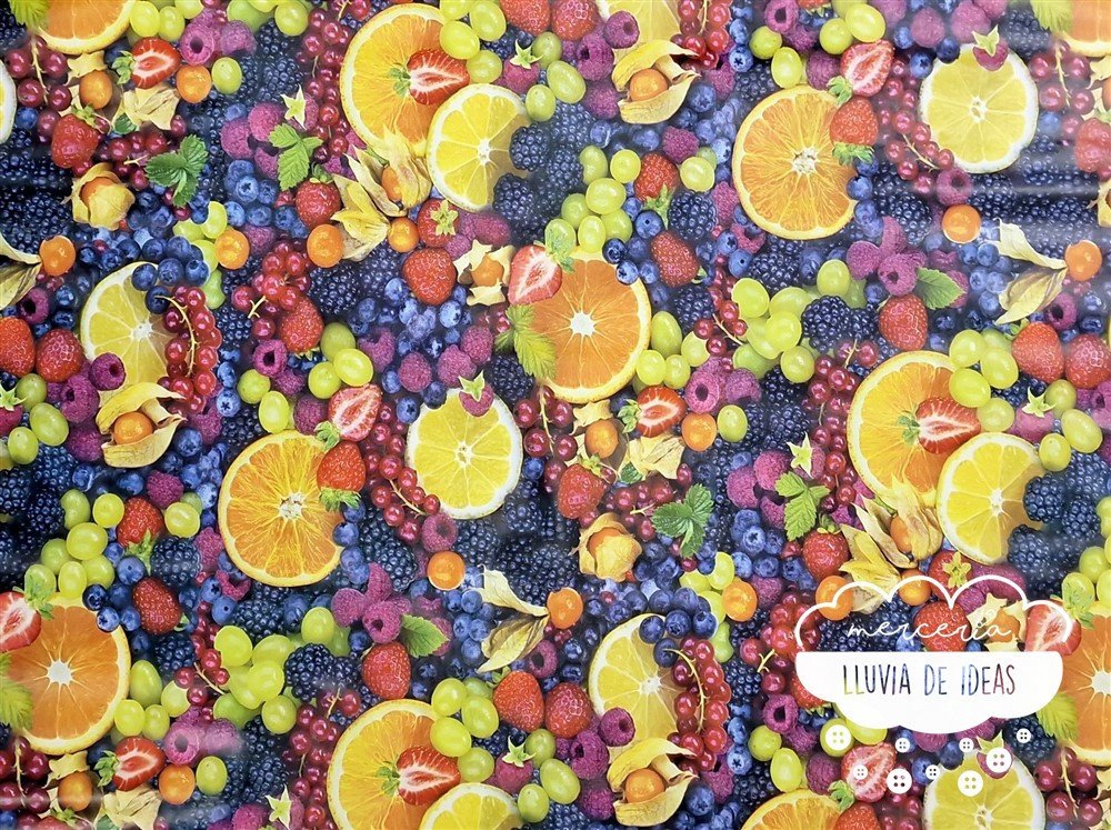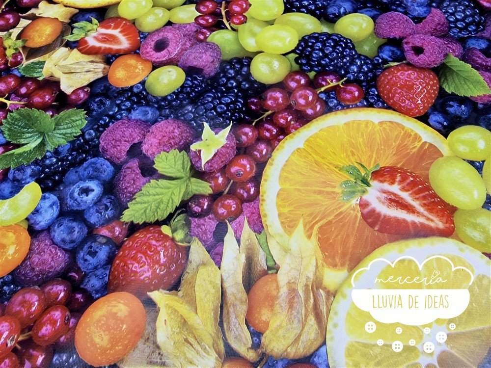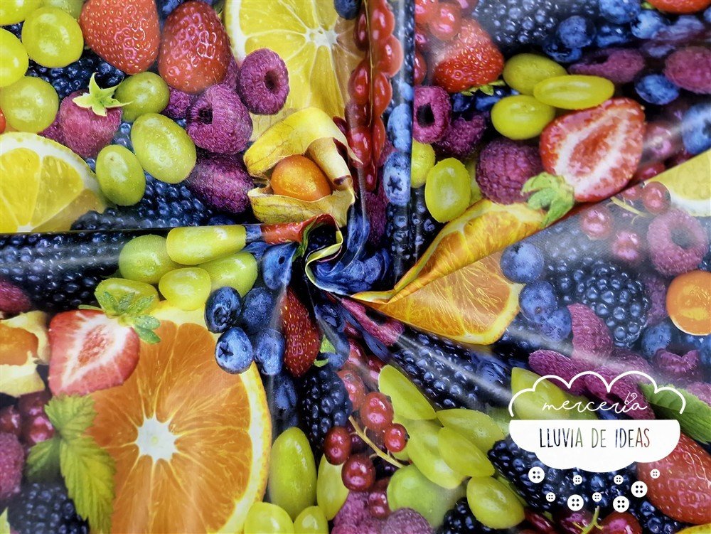 Tela hule con estampación de diferentes frutas donde predominan los frutos rojos y los cítricos. Hule antimanchas: el hule estampado es un tipo de material que se utiliza habitualmente para el uso doméstico, como mantel o cubierta para superficies de mesa. Es antimanchas, resistente al agua y otros líquidos. Se limpia fácilmente con un paño húmedo.