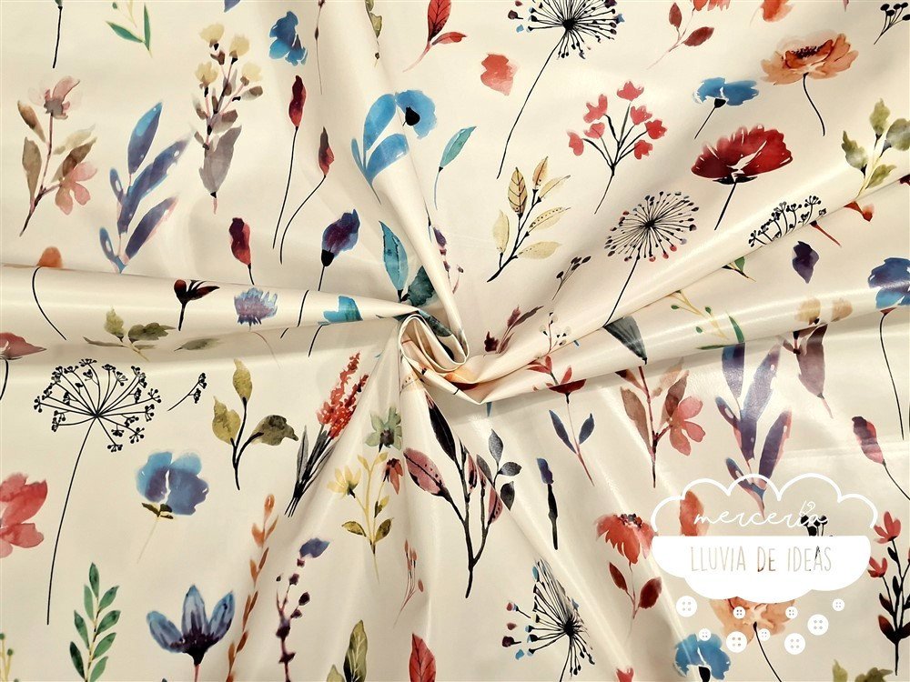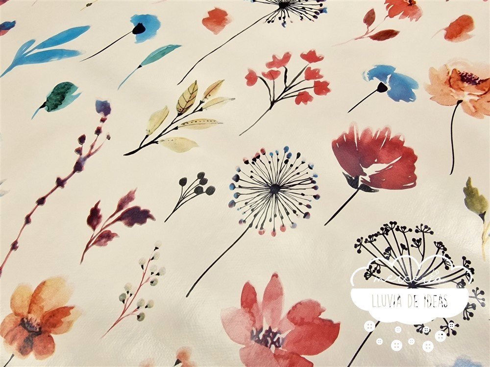 Tela hule con estampación de diferentes flores tipo acuarela sobre fondo crudo. Hule antimanchas: el hule estampado es un tipo de material que se utiliza habitualmente para el uso doméstico, como mantel o cubierta para superficies de mesa. Es antimanchas, resistente al agua y otros líquidos. Se limpia fácilmente con un paño húmedo.