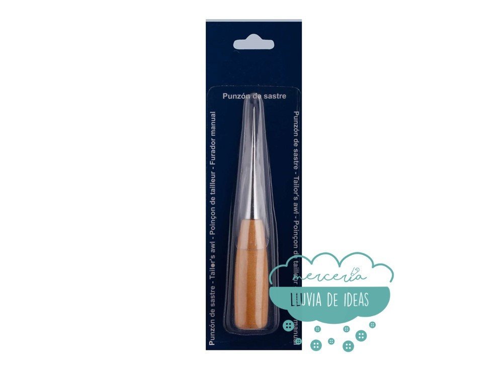 Punzón de sastre metálico con mango de madera barnizado. Diseñado para perforar agujeros pequeños y trabajos de artesanía o confección. Su punta cónica permite hacer perforaciones de diferentes diámetros.
