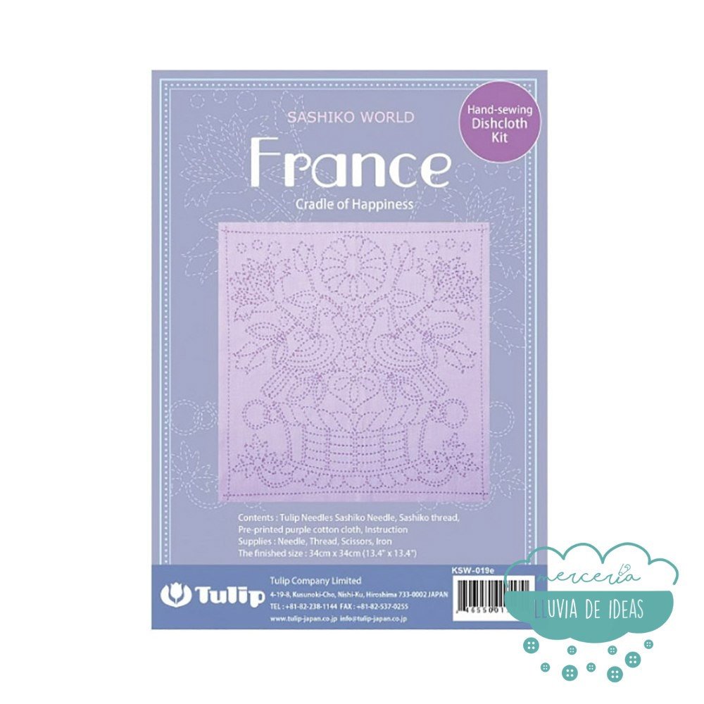Set Sashiko de Tulip modelo France "Cradle of Hapiness". Incluye todo lo necesario para completar tu mantel decorativo de cocina o tapiz, incluyendo un práctico paño preimpreso para que sea un placer bordarlo. La impresión del tejido se puede eliminar con agua una vez terminado el diseño.