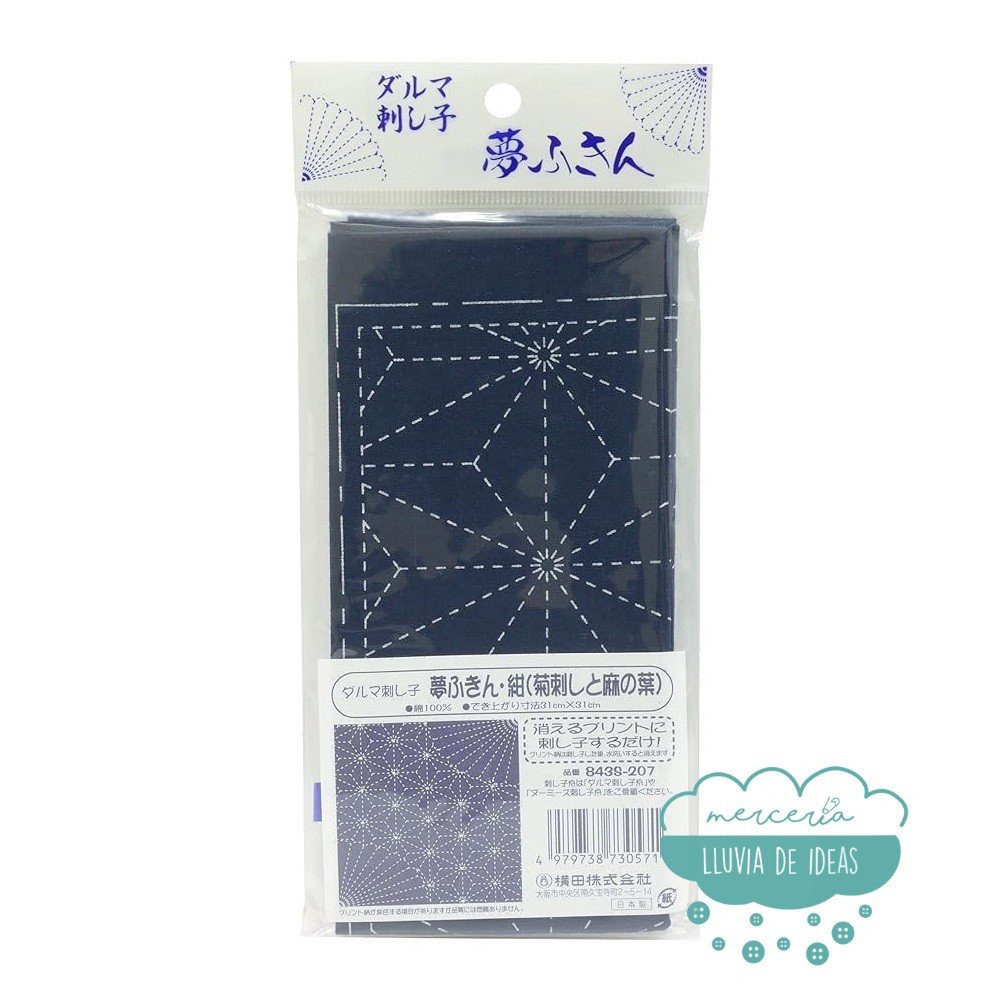 Pack tela Sashiko japonesa precortada con diseño de crisantemo y hoja de cáñamo. Incluye 1 corte de tela sashiko fondo azul con el dibujo impreso para bordar encima. El recuadro mide 31x31 cm. aprox. La impresión del tejido se puede eliminar con agua una vez terminado el diseño. La presentación viene en japonés.
